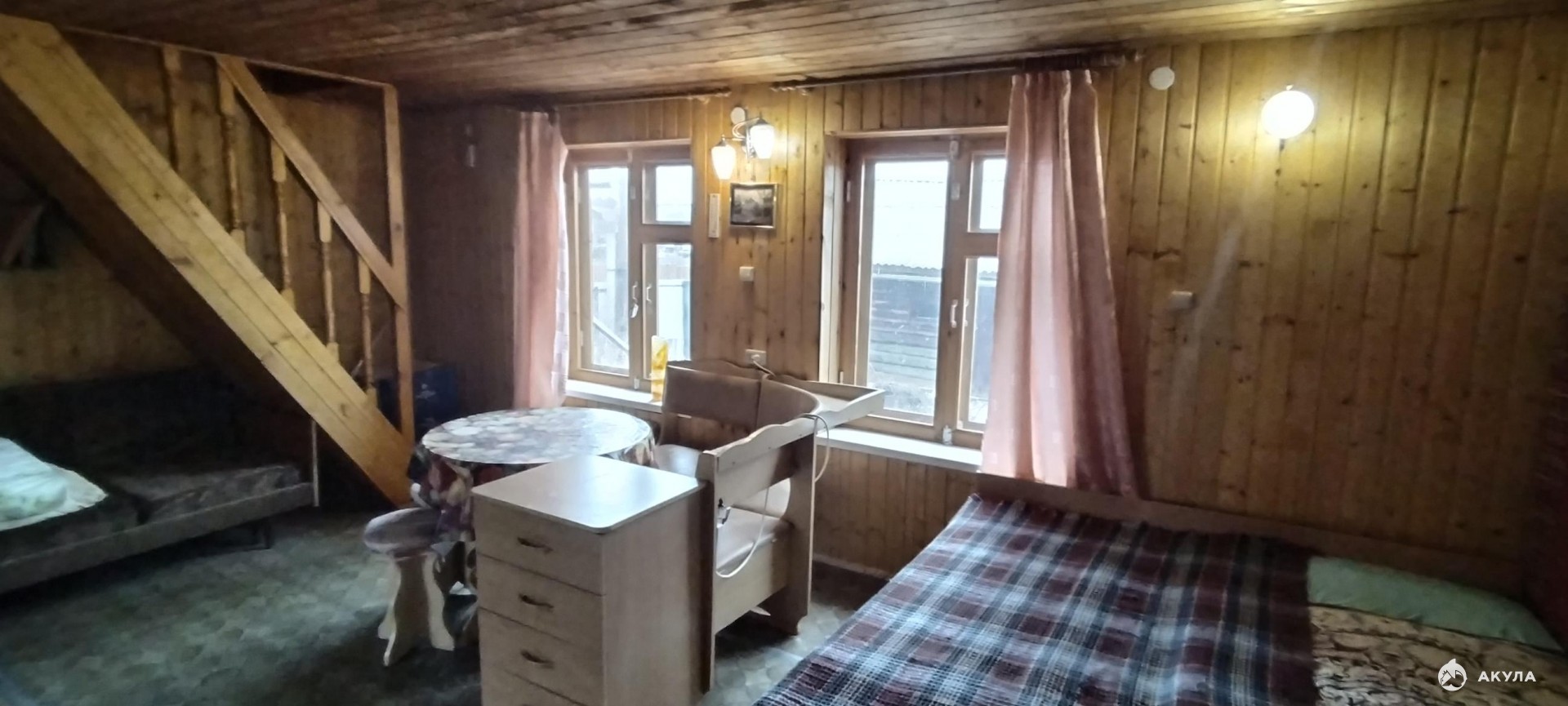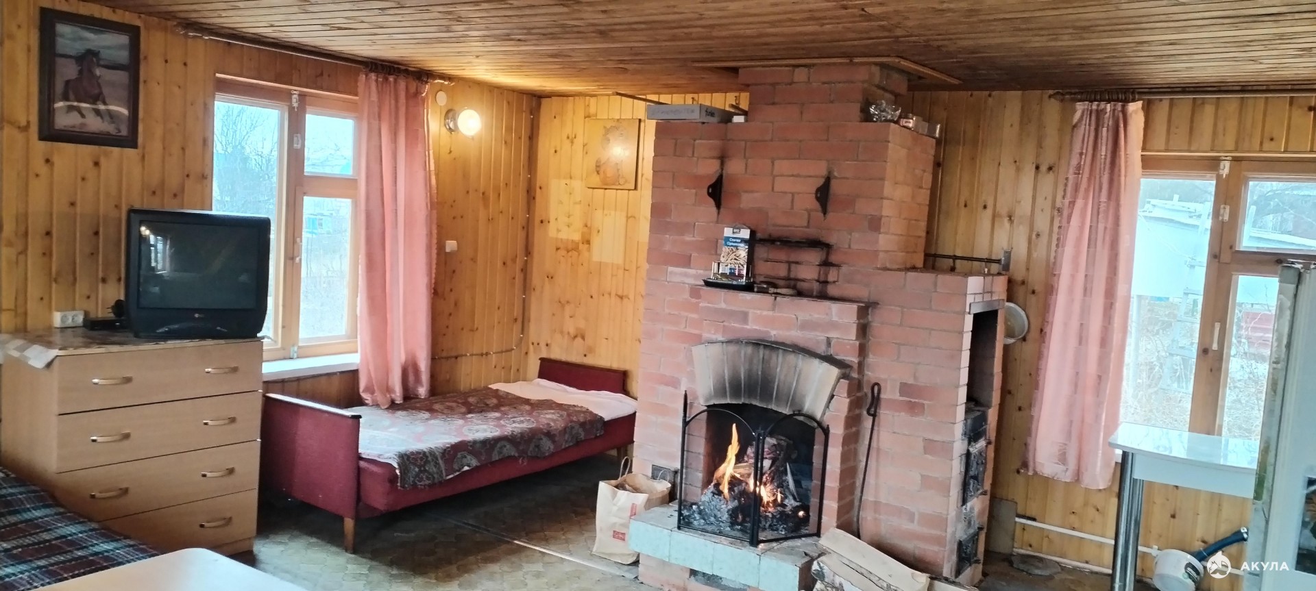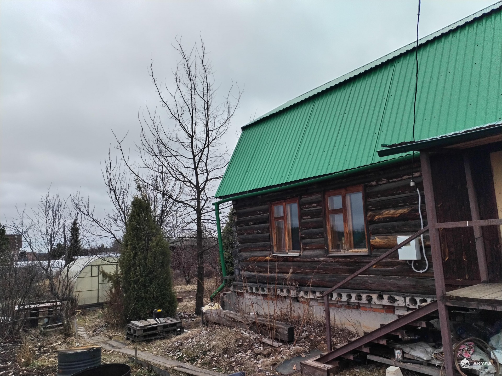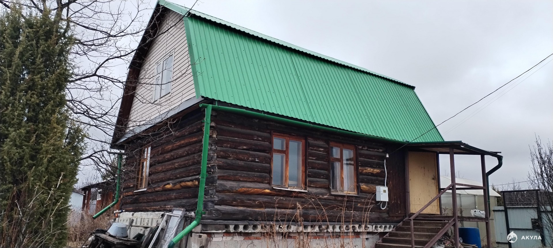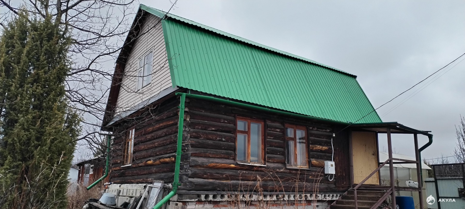 _ Отличный дом из бревна - 2 этажа и подвал, есть навес. В доме на 1 этаже: тамбур, туалет, жилая комната с камином-печью. На втором этаже 2 комнаты.