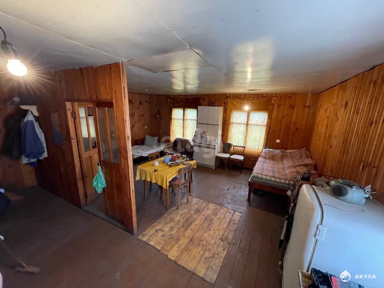 Первый этаж прихожая, кухня + гостиная, второй - летняя комната. Туалет расположен на улице.
