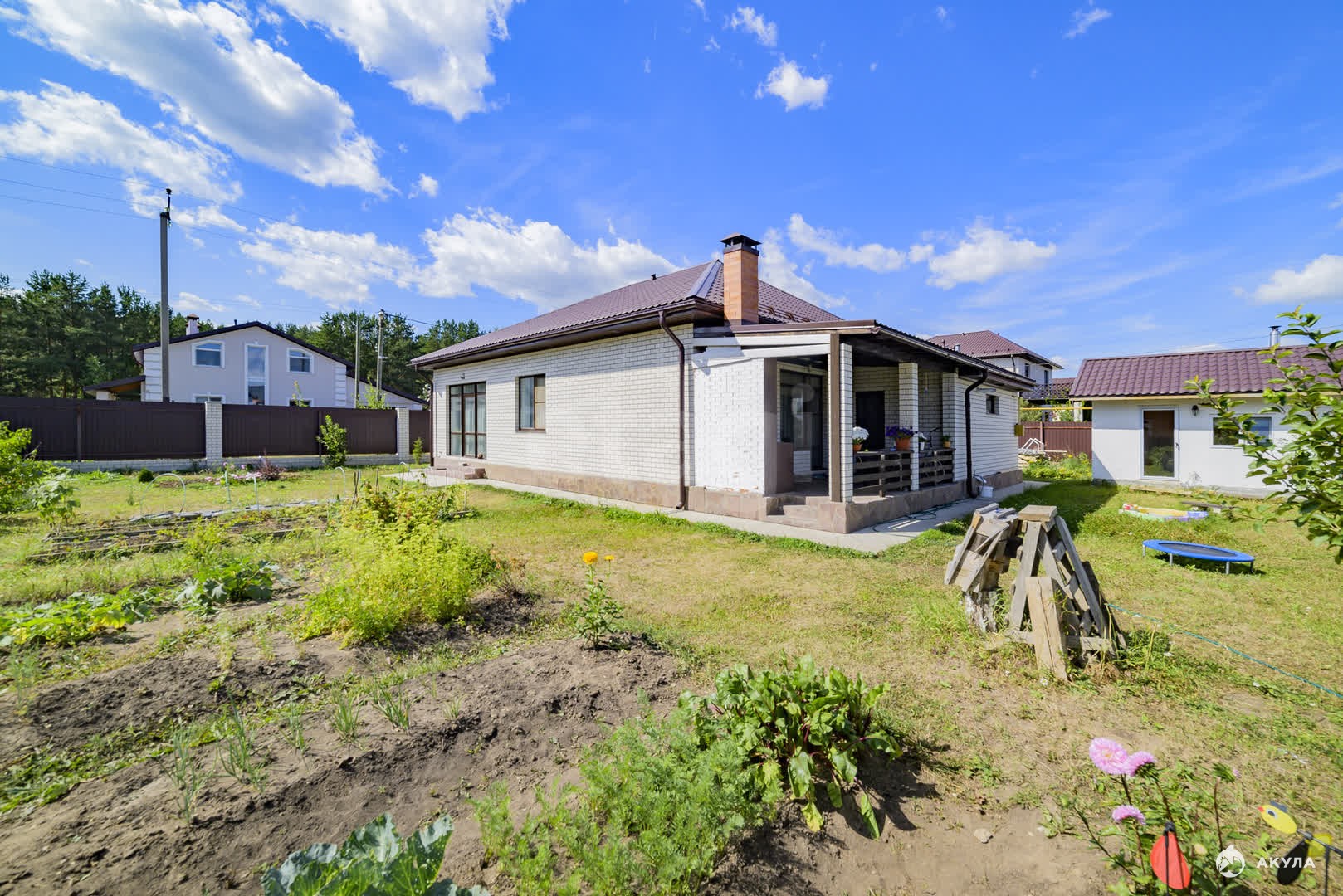 Участок полностью сформирован: выполнено ограждение капитальным забором, проведено зонирование, уложена тротуарная плитка и газон. На территории разбит сад с плодовыми деревьями и кустарниками, имеются теплицы, баня, хозяйственная постройка и летняя беседка с зоной для барбекю.