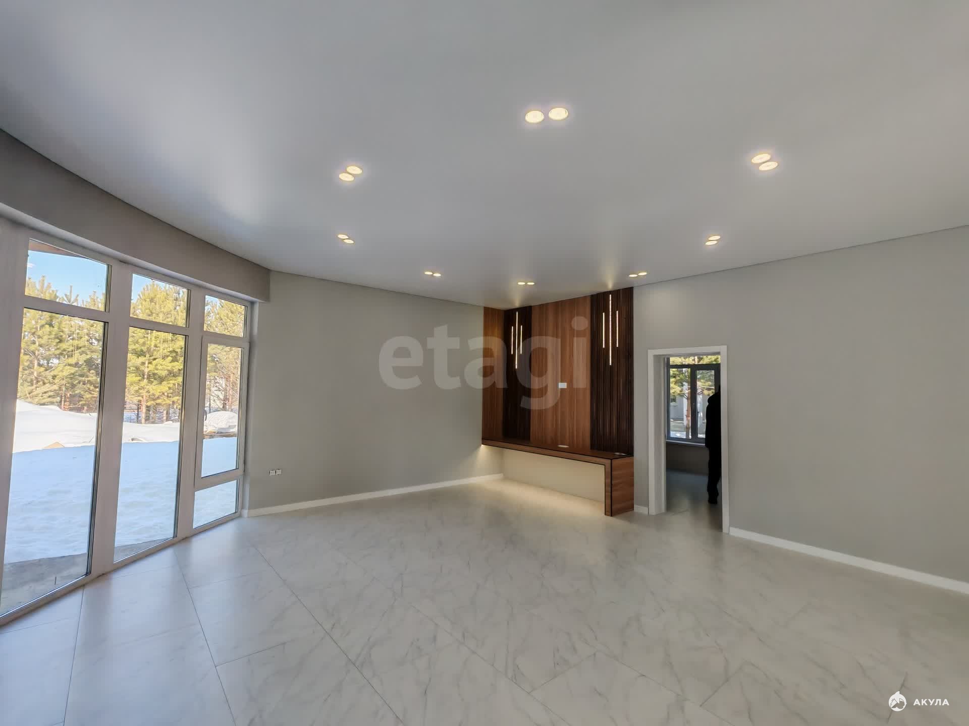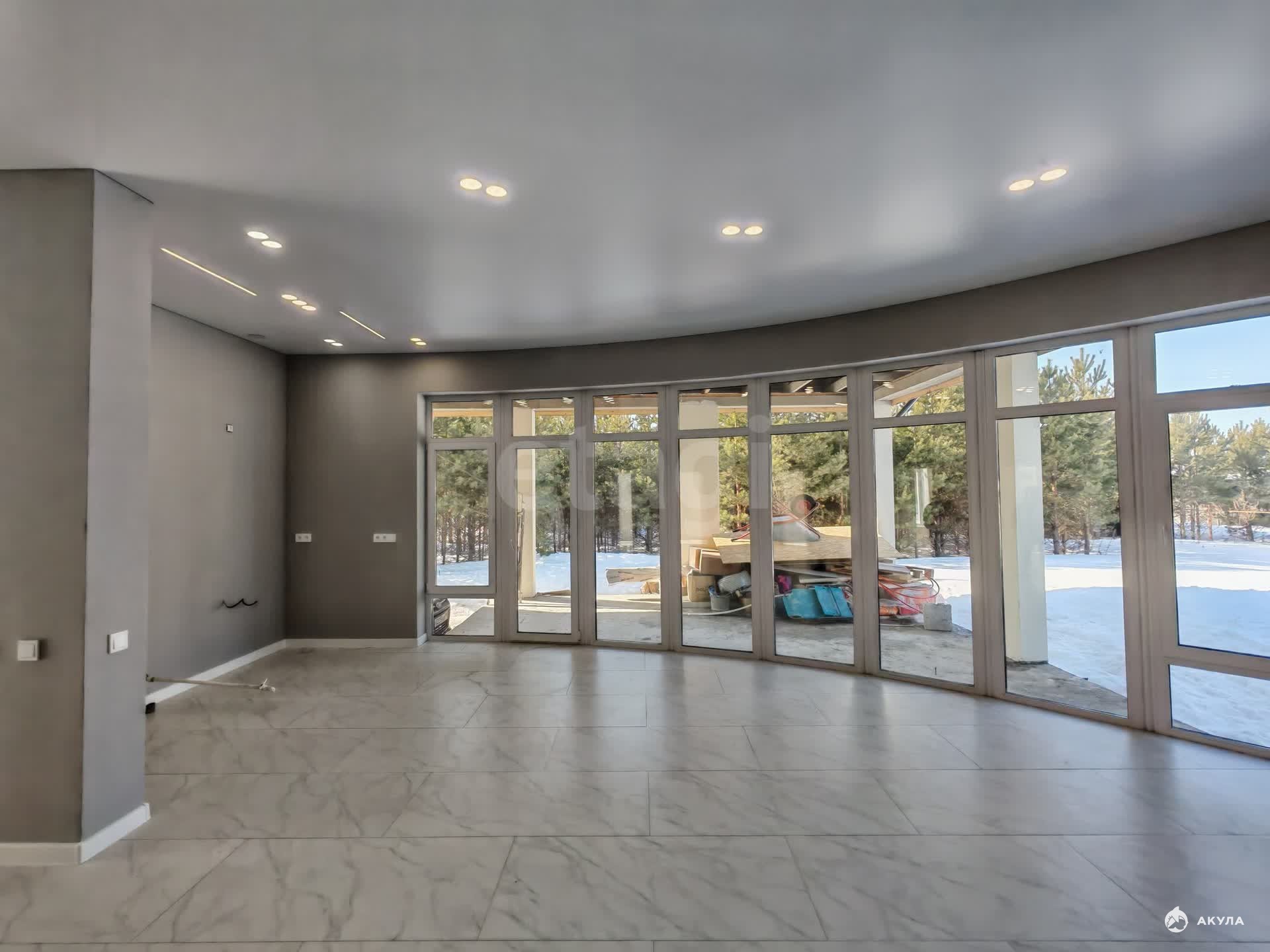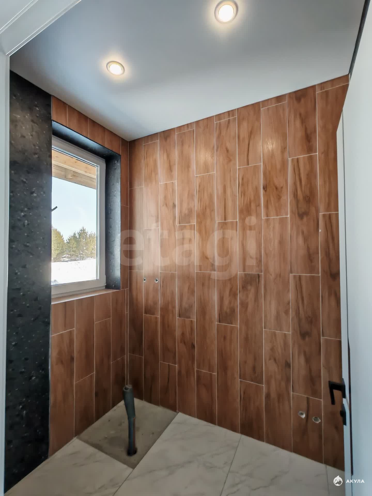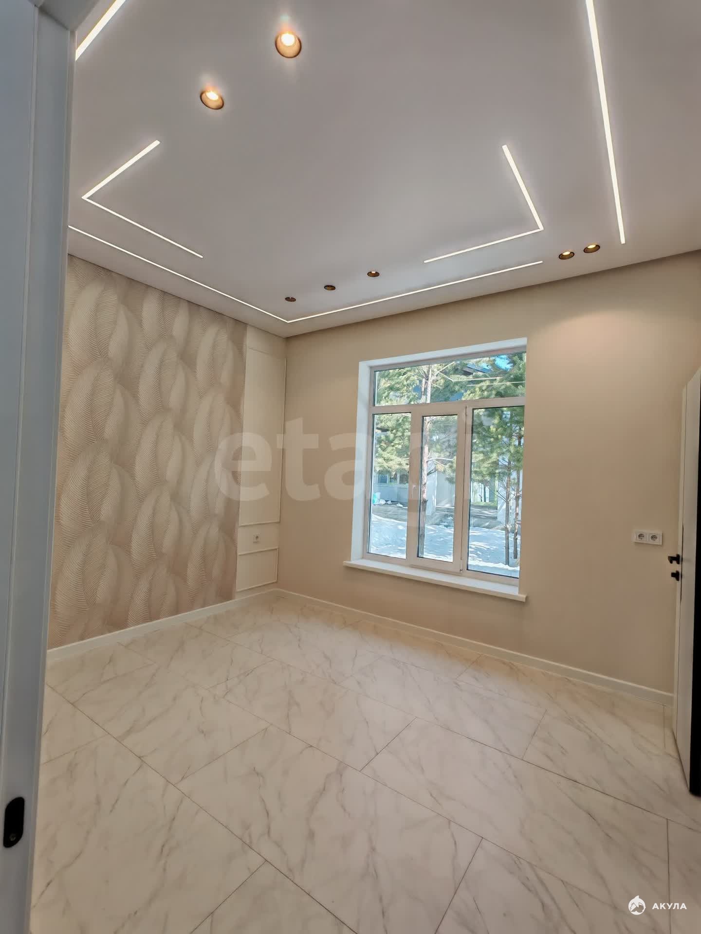 На полу керамогранит, на стенах обои, межкомнатные двери, натяжные потолки со светильниками, в санузлах плитка, в котельной котел, водонагреватель.