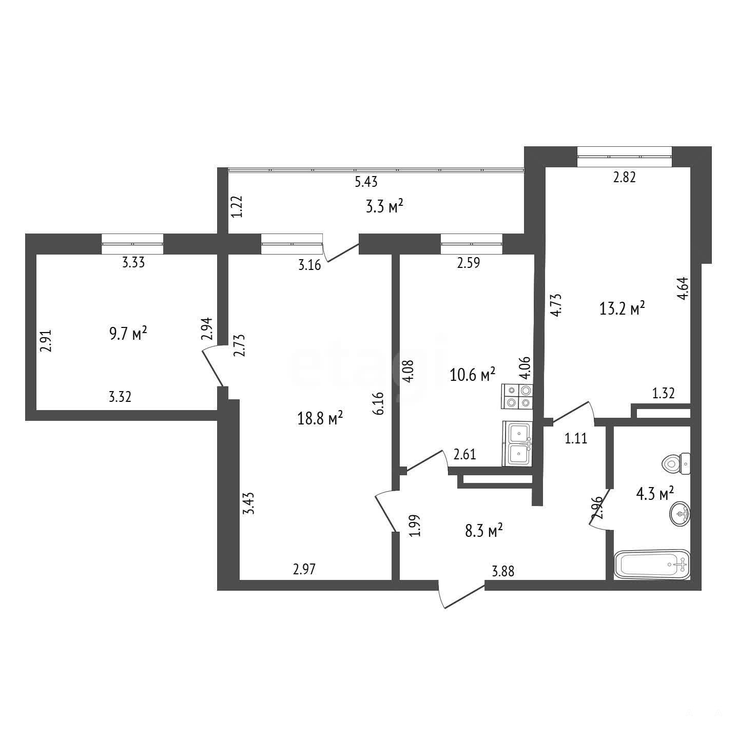 Вместительная кухня 10, 6 квадратных метров. Санузел совмещённый - 4, 3 квадратных метра, позволит установить всю необходимую технику.