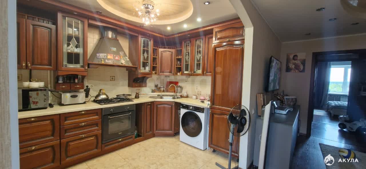 Просторная кухня оснащена современной техникой, включая холодильник, стиральную машину, духовой шкаф, газовую варочную панель.