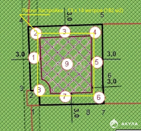Пятно застройки по ГПЗУ - 13х14 метров (182 м).
