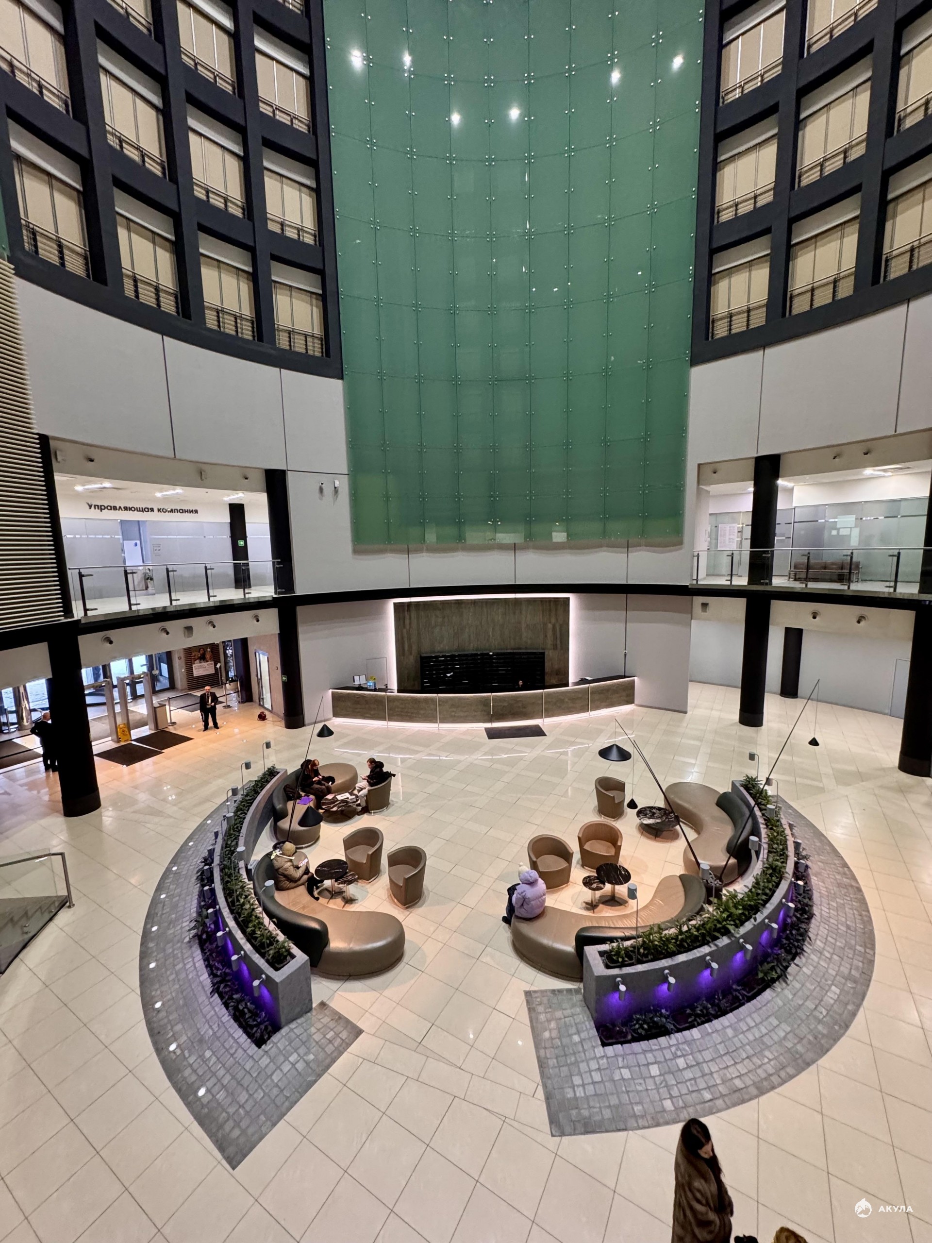 - Офисное здание включает в себя 6 лифтов, из которых 3 панорамных лифта.