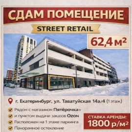 СДАМ ПОМЕЩЕНИЕ STREET RETAIL 62, 4 м² г. Екатеринбург, ул. Таватуйская 14а/4 ✔ Рядом с магазином «Пятёрочка» ✔ и пунктом выдачи заказов Ozon ✔ Расположен на 1 этаже паркинга ✔ Панорамное остекление Идеально под торговлю: ✔ Аптека ✔ Магазин цветов ✔ Продажа разливного пива ✔...