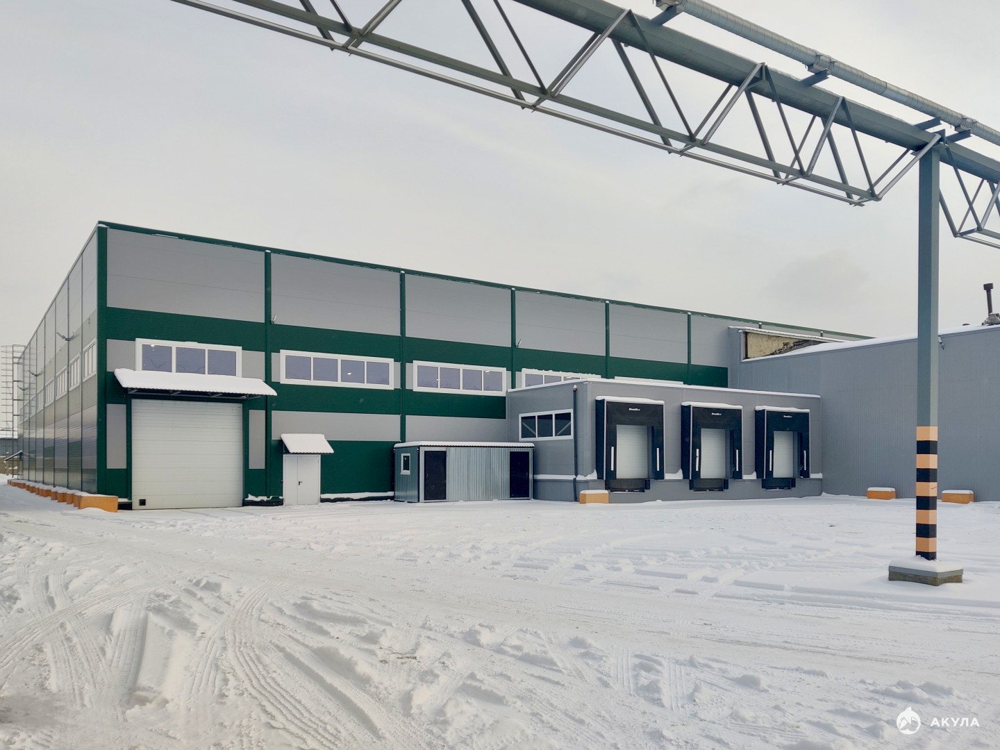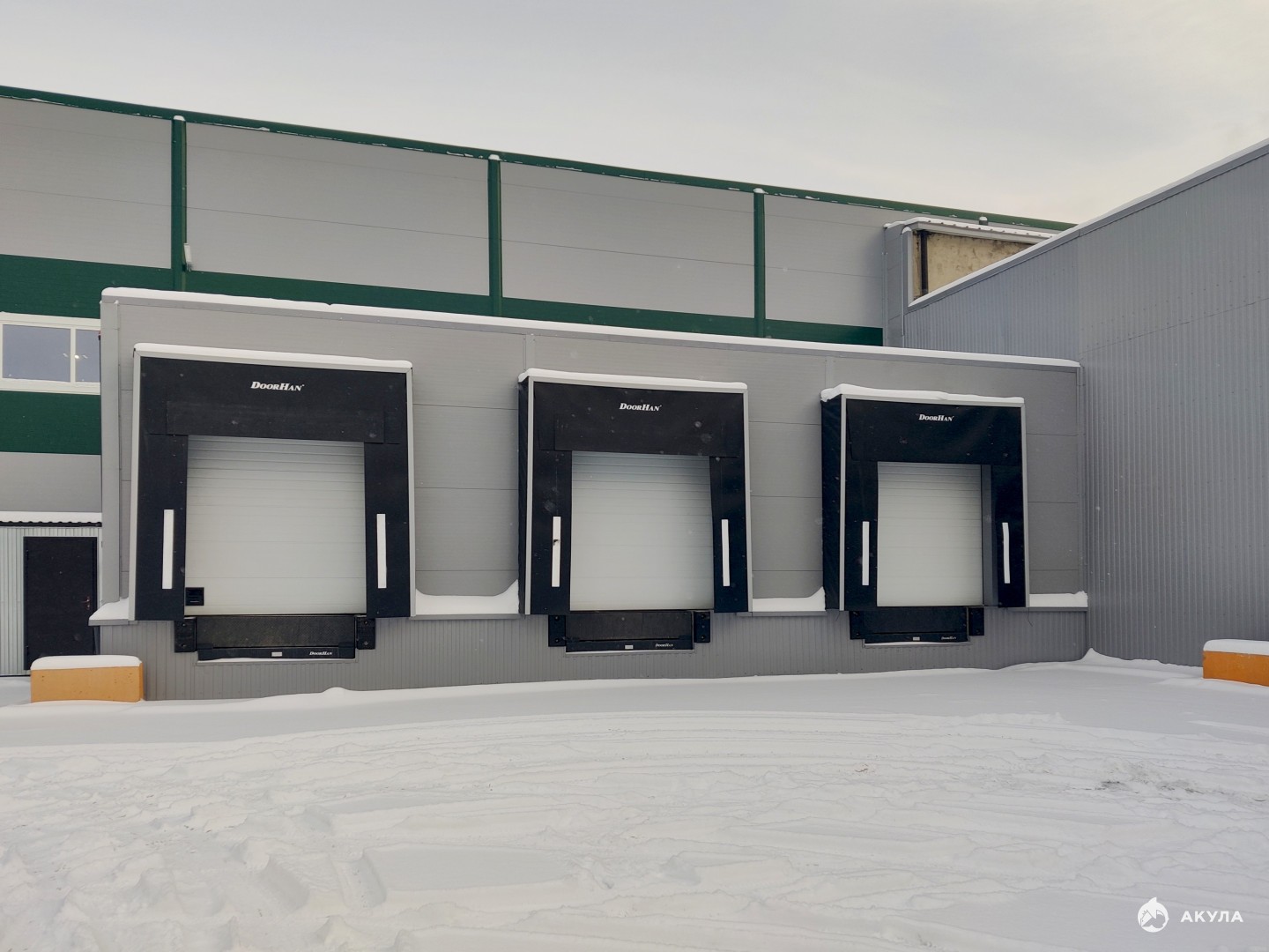 Четверо ворот: трое докового типа с погрузочно-разгрузочными площадками регулируемой высоты и одни ворота 4, 5*4, 5 метра на нулевой отметке.