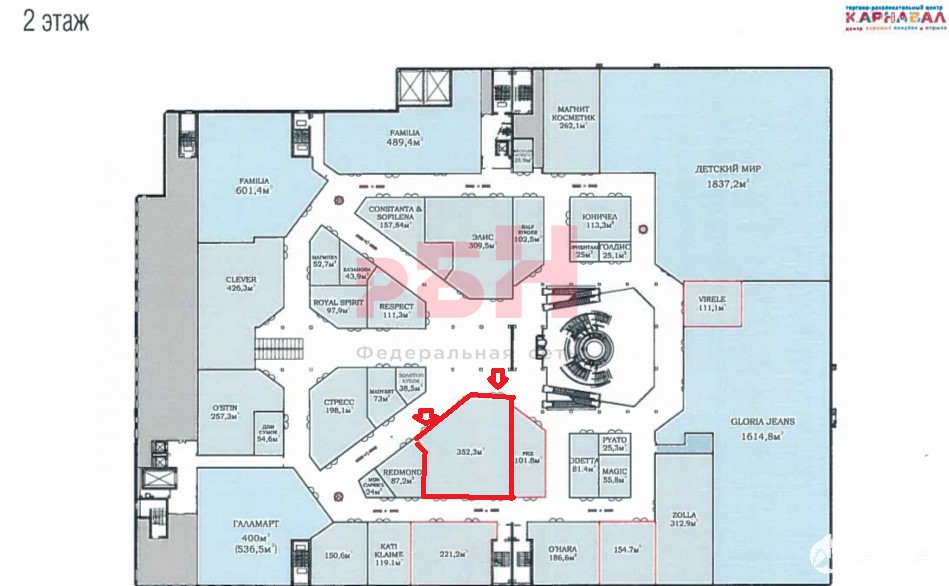 Предлагается в аренду торговое помещение общей площадью 352.3 кв.м., расположенного в ТРЦ Карнавал на втором этаже.