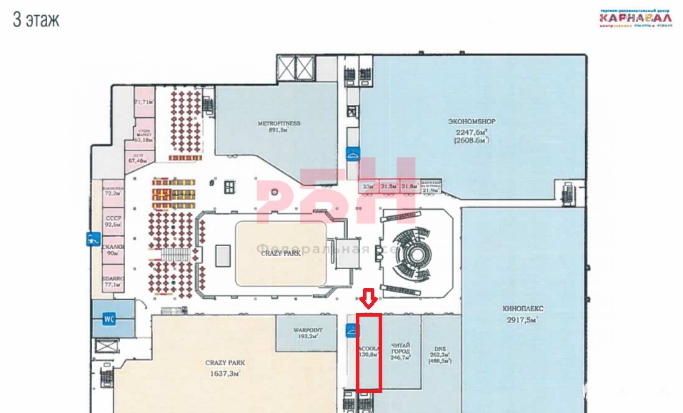 Предлагается в аренду торговое помещение общей площадью 130, 8 кв.м., расположенного в ТРЦ Карнавал на третьем этаже.