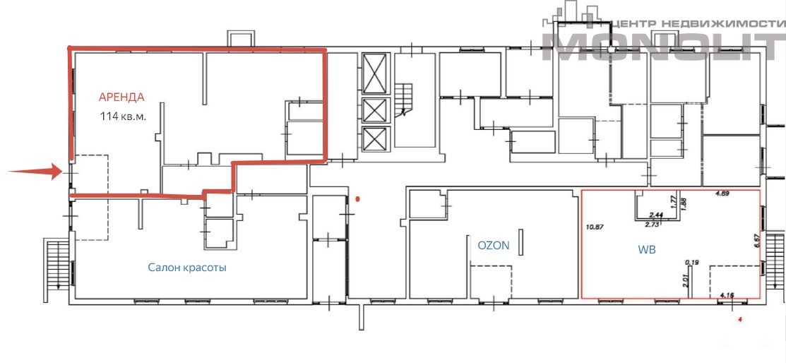 Соседние помещения занимают: продовольственный магазин Магнит, интернет-магазины OZON и WB, салон красоты.