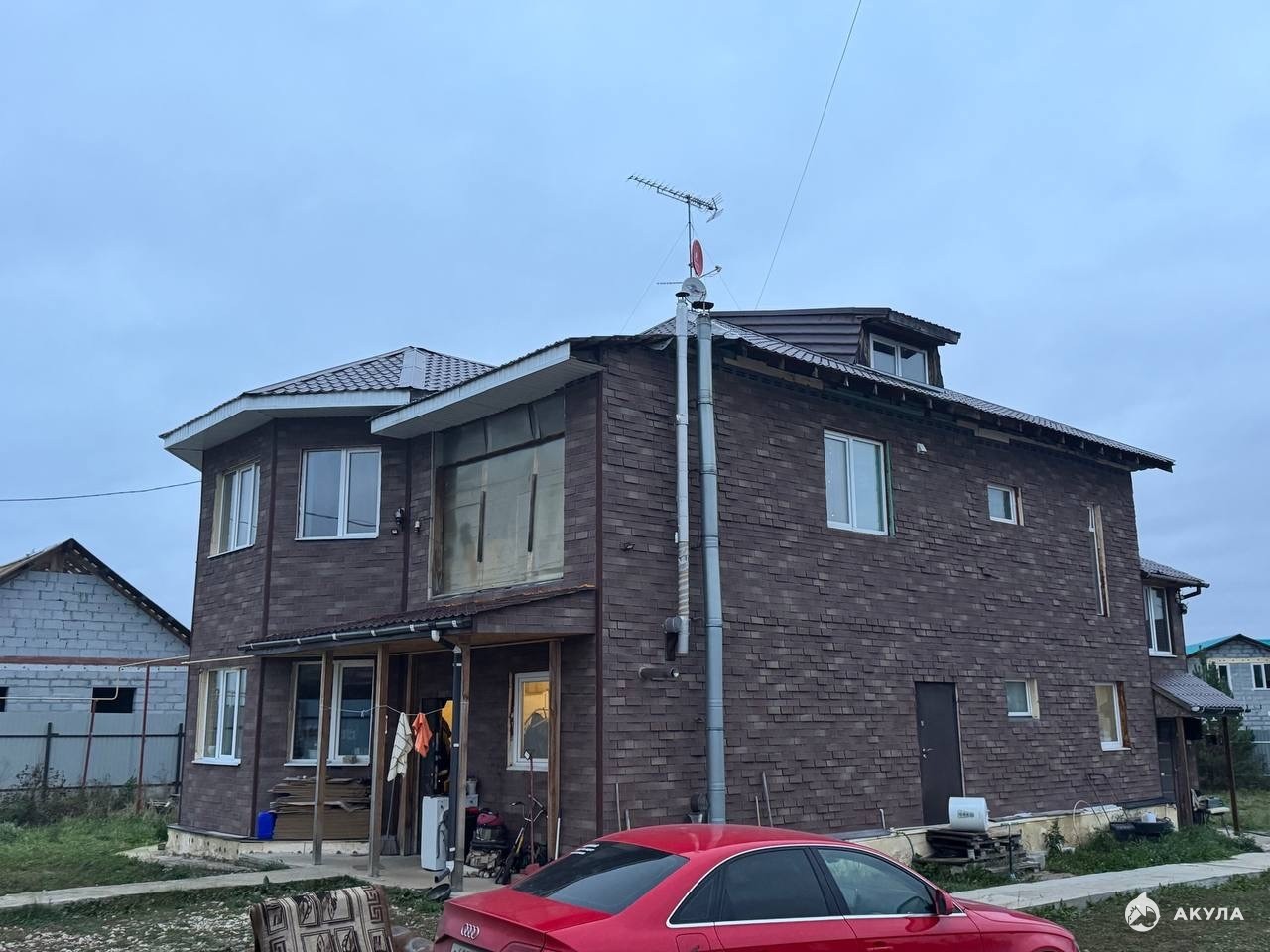 Фундамент — монолитная плита, стены выполнены из самого толстого газоблока, утеплён пеноплексом и отделан имитацией кирпича производства компании ТехноНИКОЛЬ.
