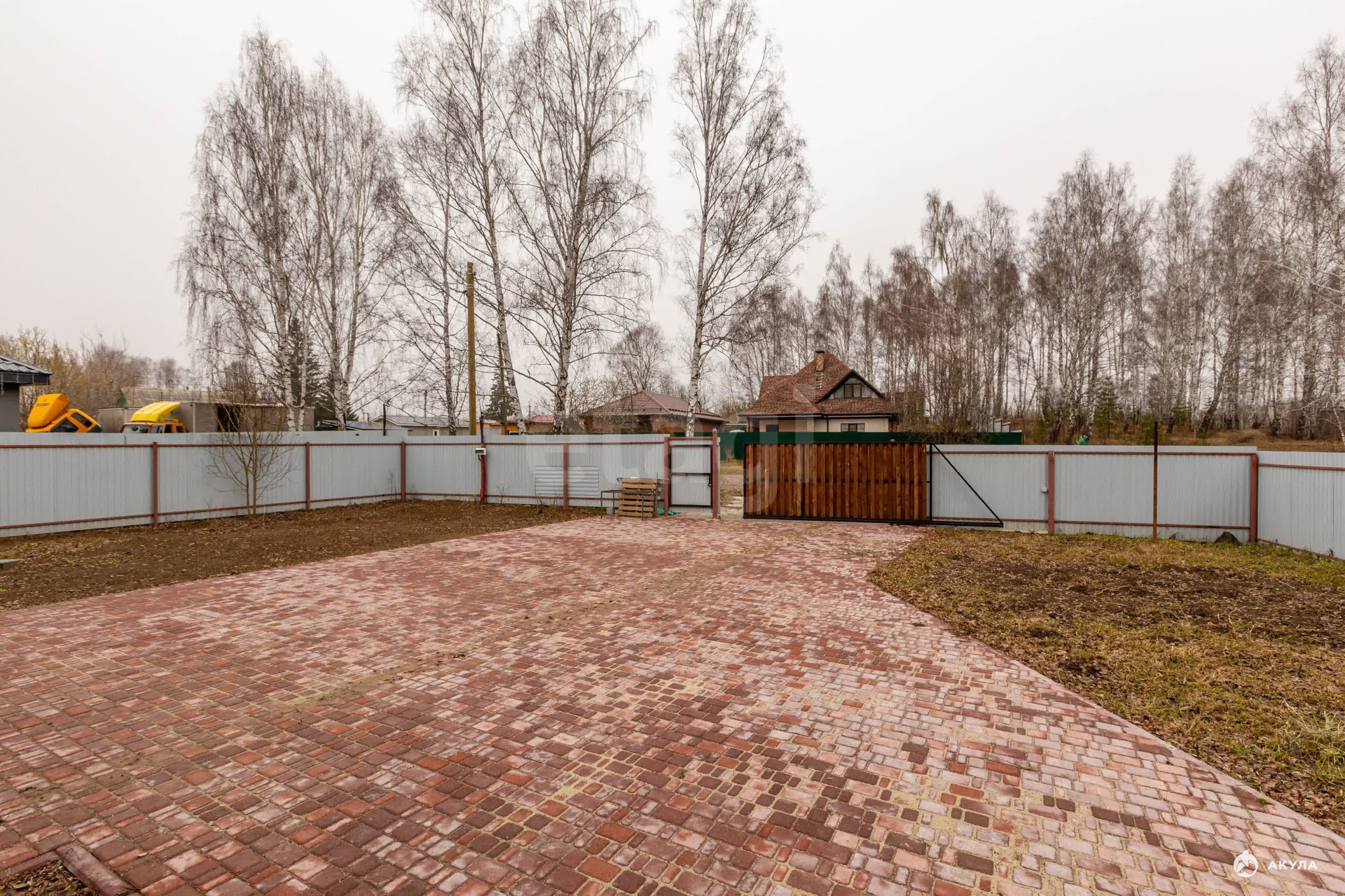 Участок правильной формы, полностью огорожен забором из профнастила с воротами, внутри обустроена парковочная площадка из камня.