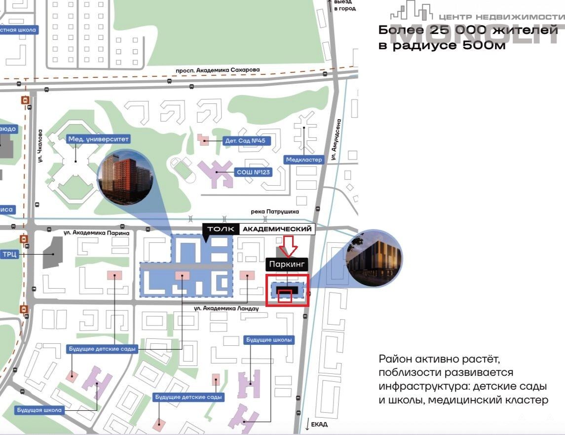 Жилой комплекс «Толк Академический» представляет собой современное монолитно-кирпичное здание с переменной этажностью ( 17-25 этажей), удобно расположенное между улицами Академика Парина и Ландау. На территории комплекса планируется обустройство детских и спортивных площадок, а также озеленение для создания комфортной и приятной обстановки для жильцов.