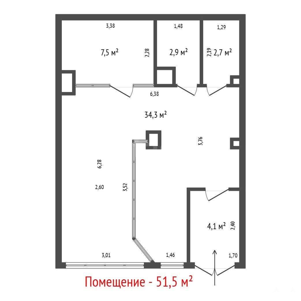 Площадь: 51, 5 м2, кабинетная планировка