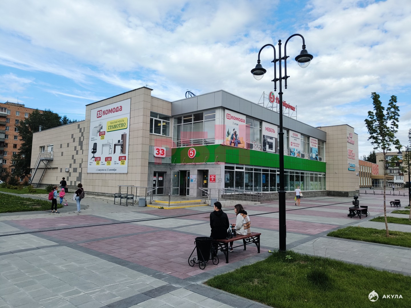 - на 1 этаже продовольственная сеть "Пятерочка", на 2 этаже мебельная сеть «33 Комода».