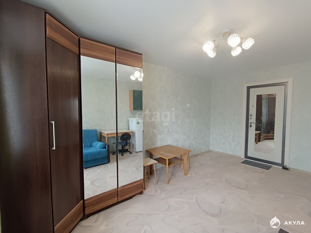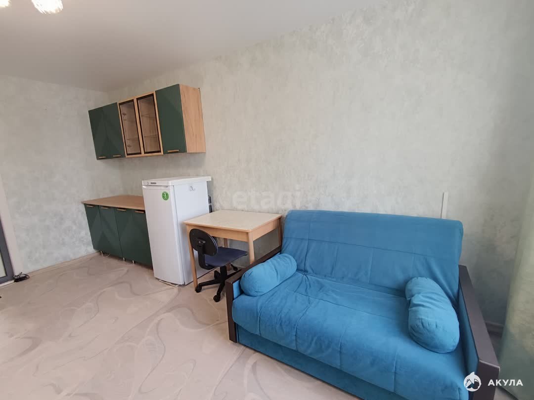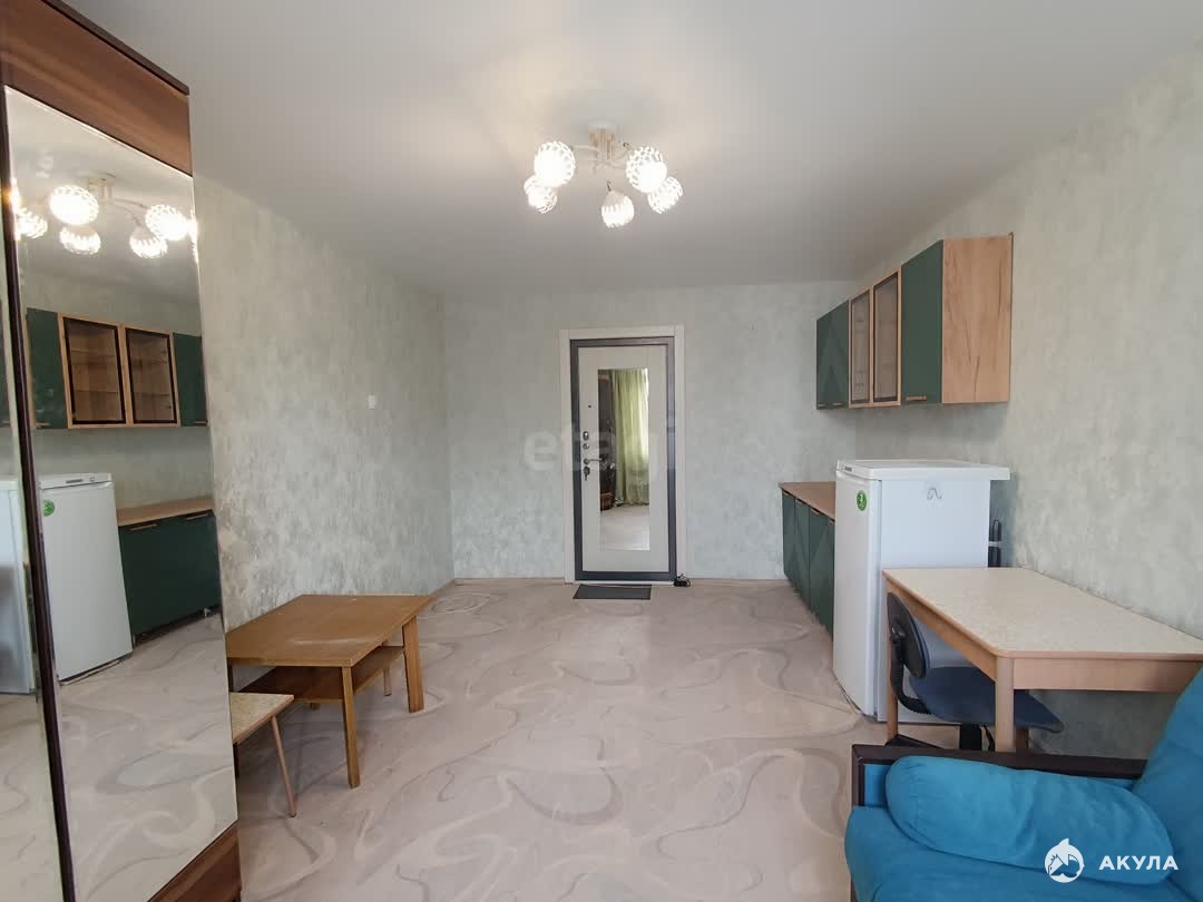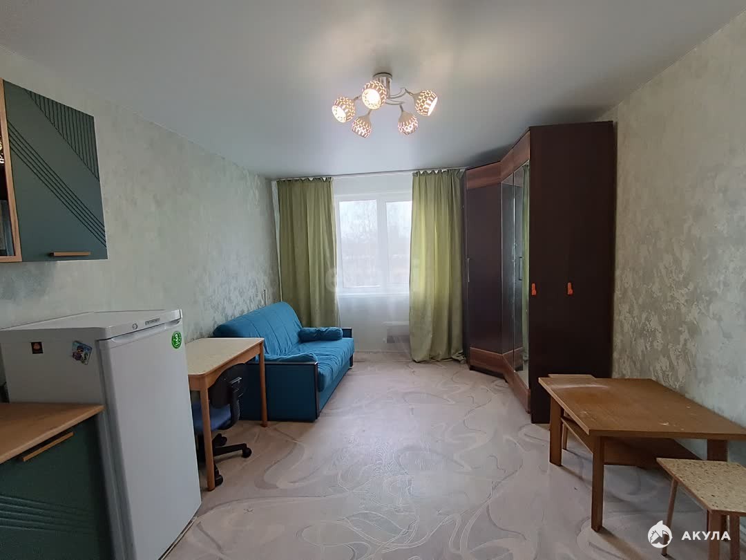 Вся необходимая мебель и техника уже на месте — диван-кровать, просторный шкаф, холодильник, отдельная стиральная машина, а также новый кухонный гарнитур в общем пространстве.