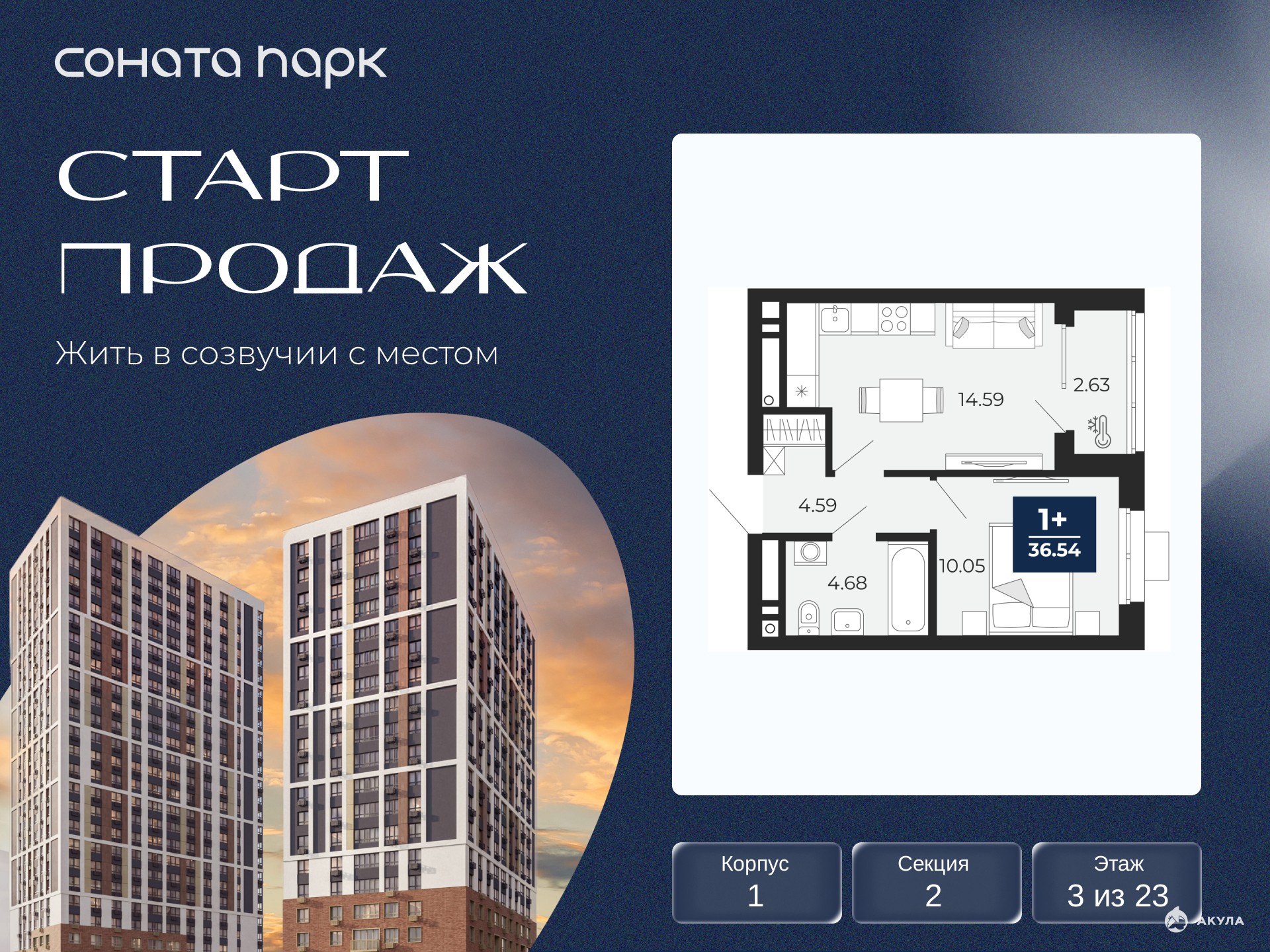 Однокомнатная квартира с предчистовой отделкой в ЖК "Соната Парк" на 3 этаже. Общая площадь: 36.54 кв.м., жилая: 10.05 кв.м., площадь просторной кухни-столовой: 14.59 кв.м. Все окна выходят на одну сторону. В квартире одна лоджия, один совмещенный санузел. Высота потолков 2.72 м.
