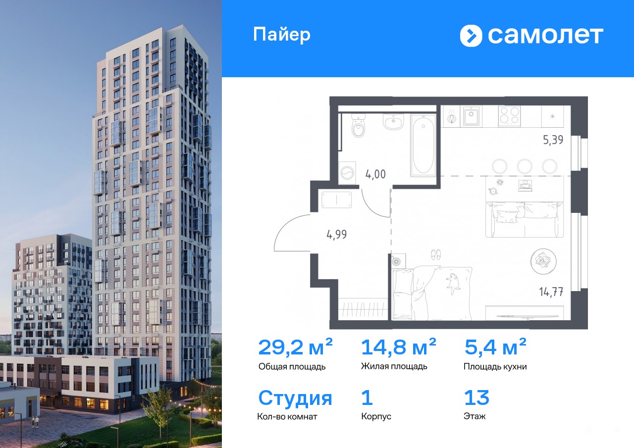 Строим кварталы для жизни с заботой о будущем. Предлагается квартира студия комфорт-класса 29, 15 кв.м в корпусе 1 на 13 этаже, в ЖК «Пайер»