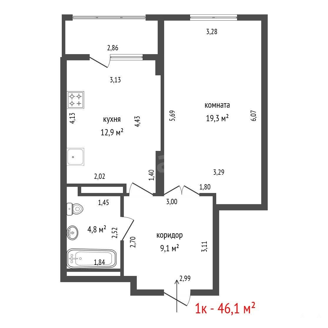 Квартира просторная, площадь 46, 7 кв.м. , кухня -гостиная 12, 9 кв.м., комната 19, 3 кв.м., санузел 4, 8 кв.м., большой коридор.