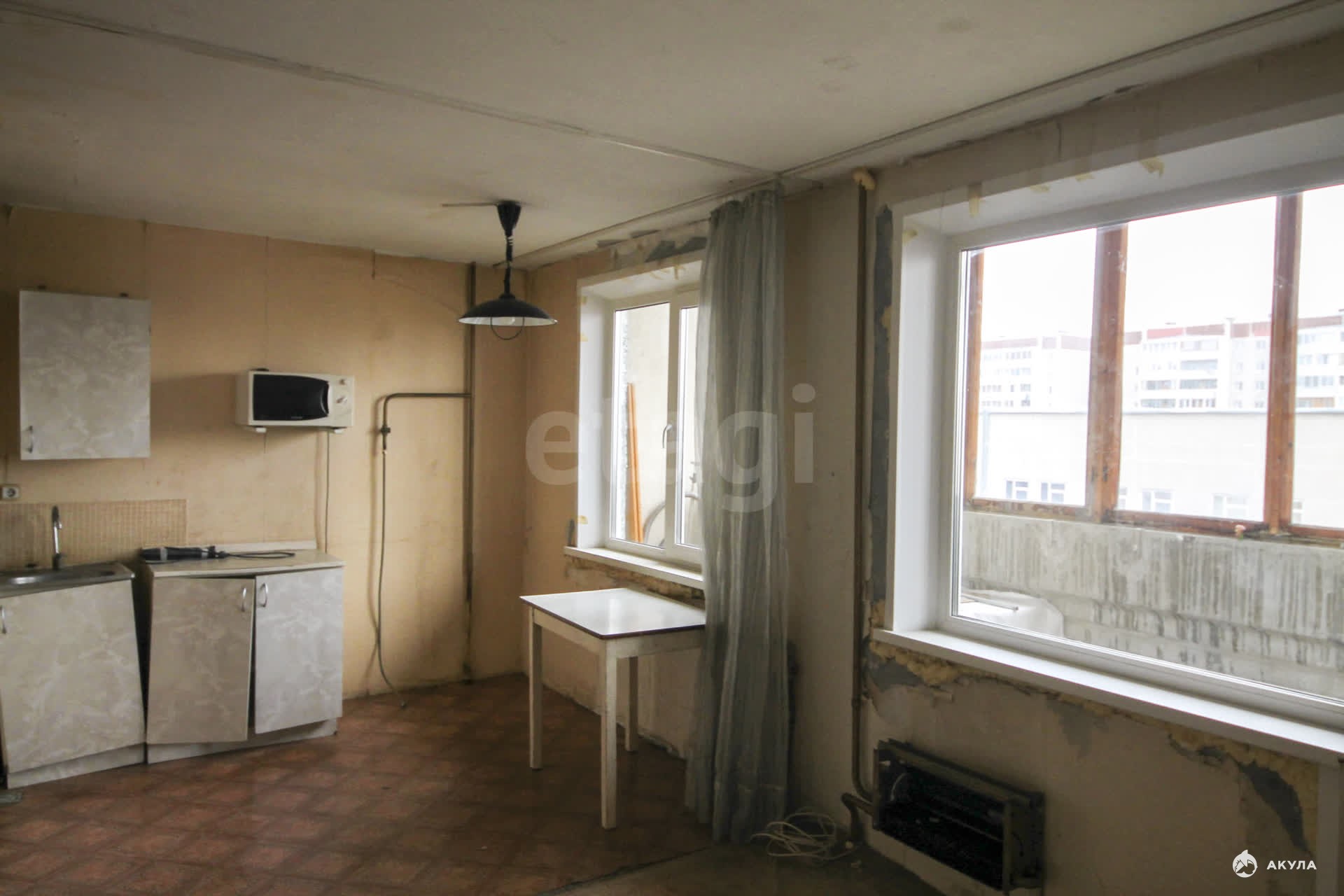 В квартире убрана стена между кухней и комнатой.