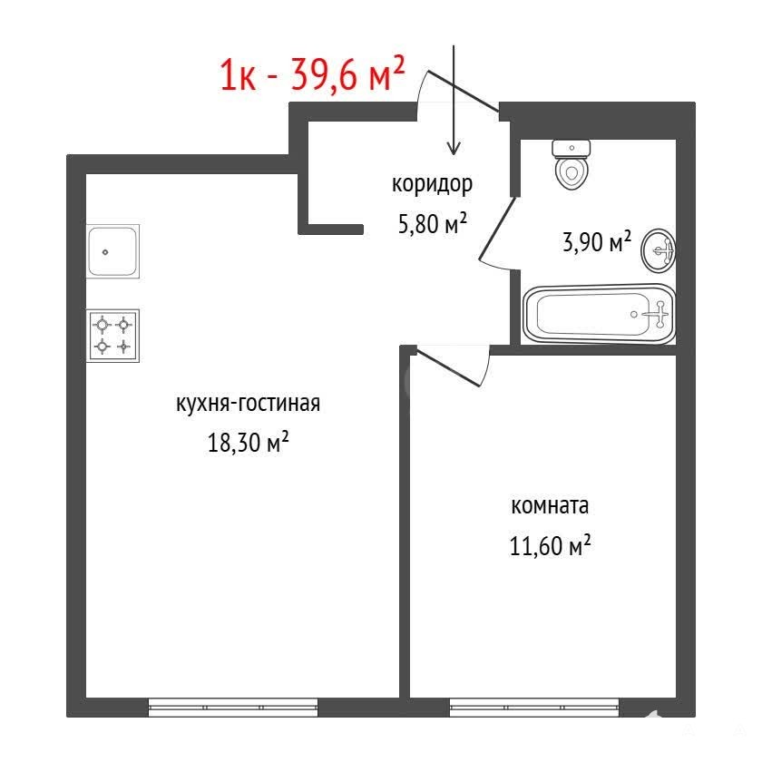 Планировка четко разделена на просторную кухню-гостиную 18, 3 кв.м и изолированную спальню 11, 6 кв.м.