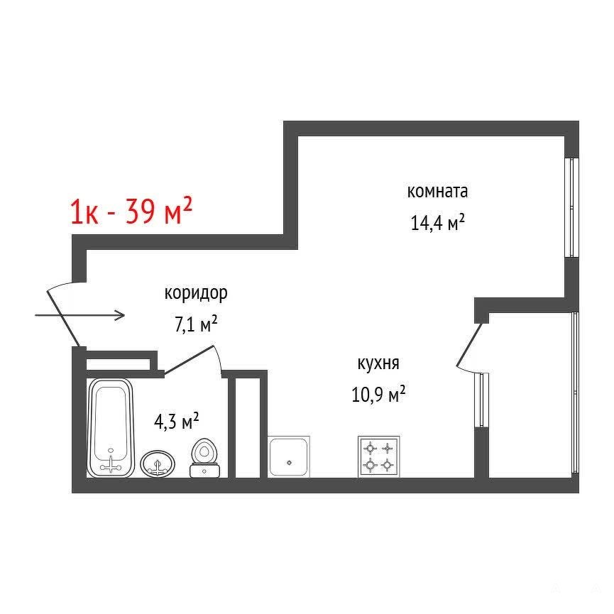 Просторная спальня 14, 6 метра, кухня 11 метров, коридор с нишей под шкаф 7, 3 метра и санузел 4, 5 метра.