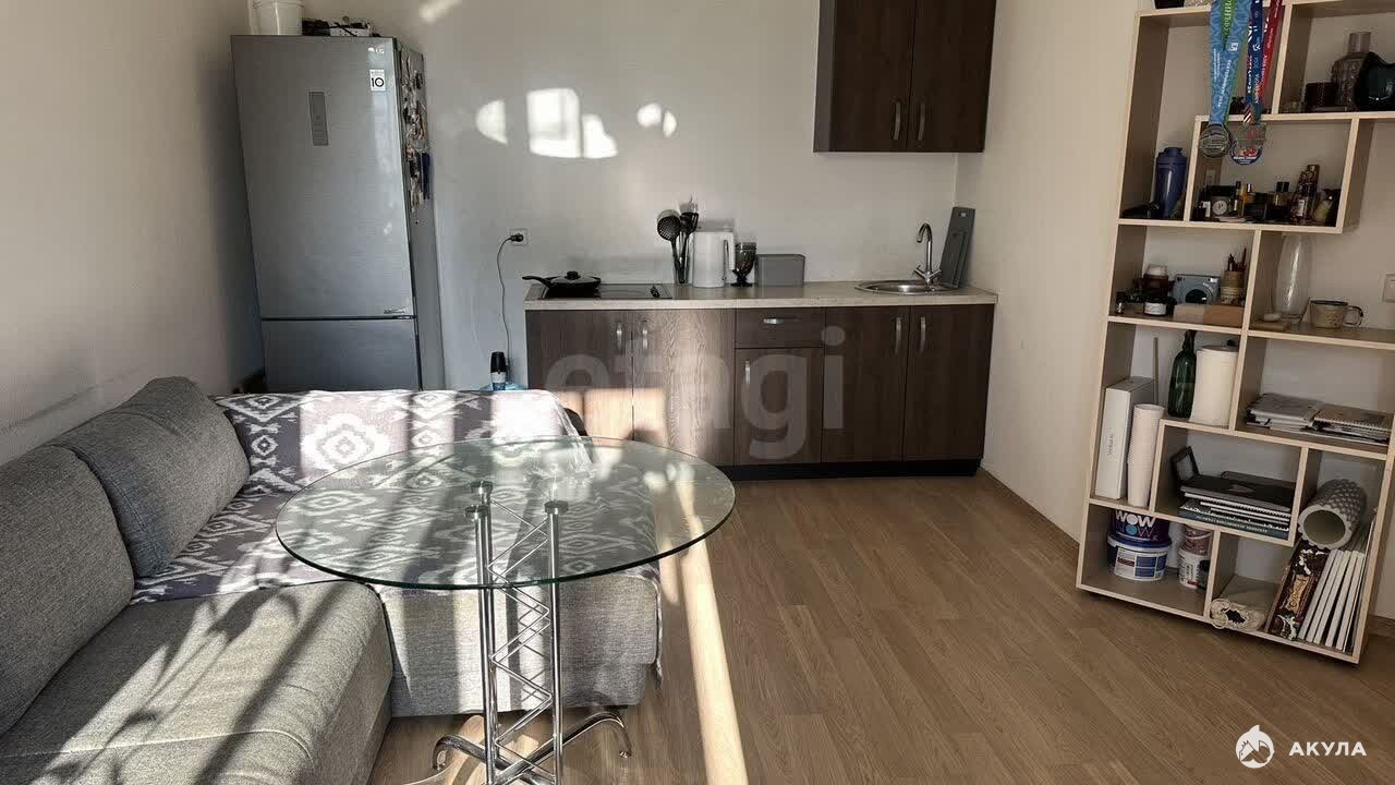 Объект отличается выгодной планировкой: изолированная спальня, отдельная гардеробная и большая кухня-гостиная нестандартной формы с выходом на застекленный балкон с панорамным остеклением.