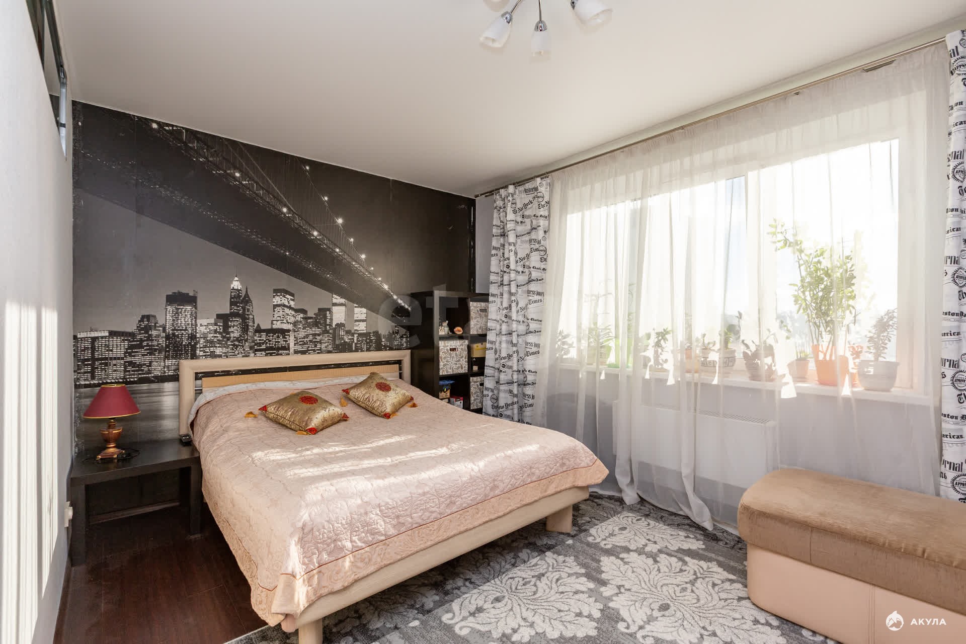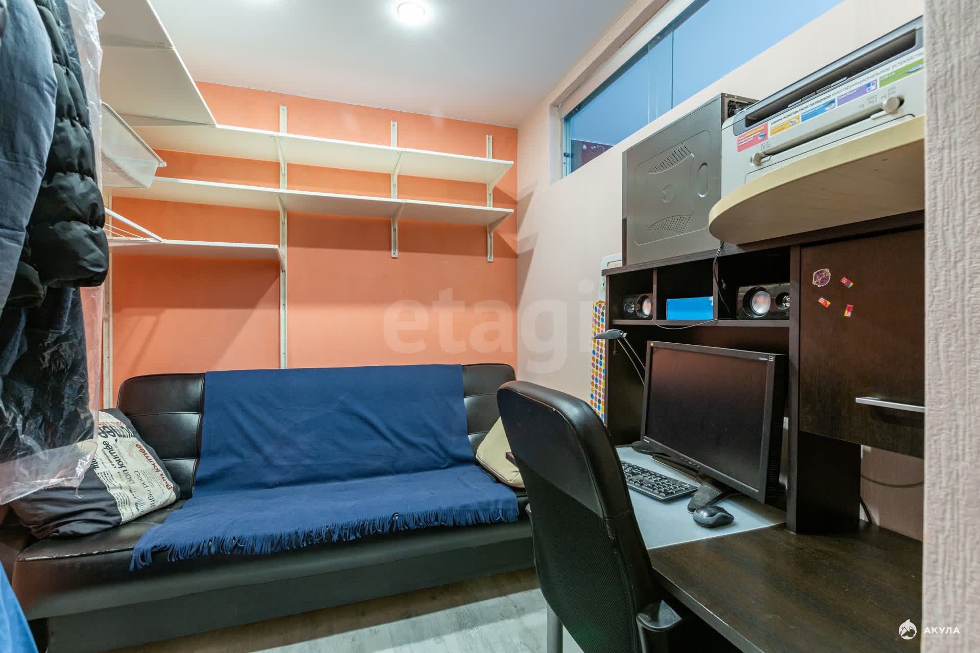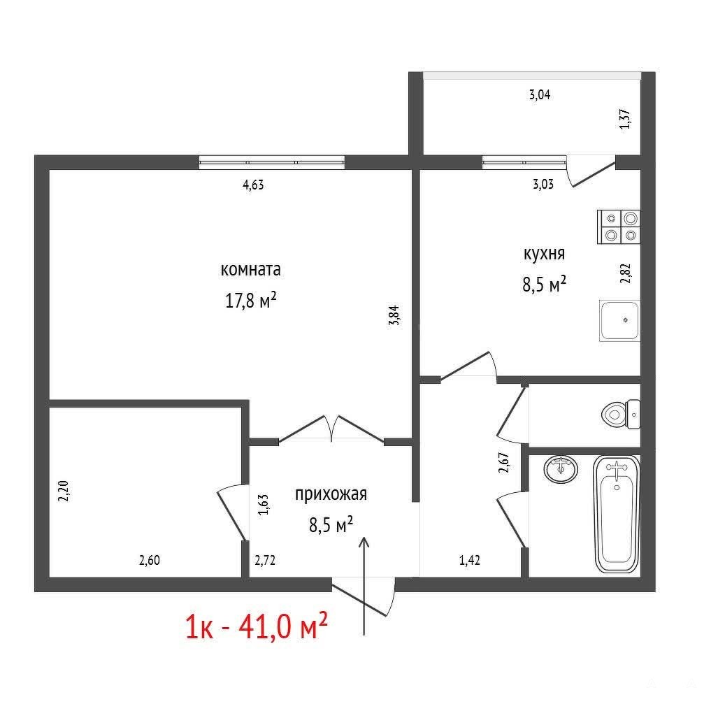 Все помещения правильной формы: комната 17, 8 кв. м., кухня 8, 5 кв. м., кабинет 5, 7 кв. м. Просторная гардеробная переоборудована в функциональный кабинет с межкомнатным окном, что обеспечивает приток воздуха и дневного света. В кабинете можно разместить детскую зону. Из кухни выход на застекленную лоджию. Окна выходят на соседний двор. В квартире раздельный санузел.