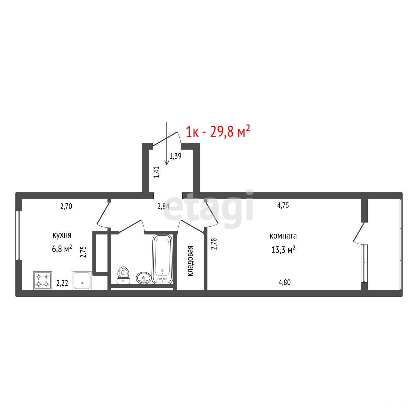 - *Площадь:* 29.8 м², кухня — 6.8 м².