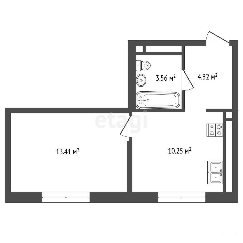 Просторная кухня плащадью 10, 25 м2 и спальня 13, 41 м2, в коридоре удачно расположится вместительный шкаф.
