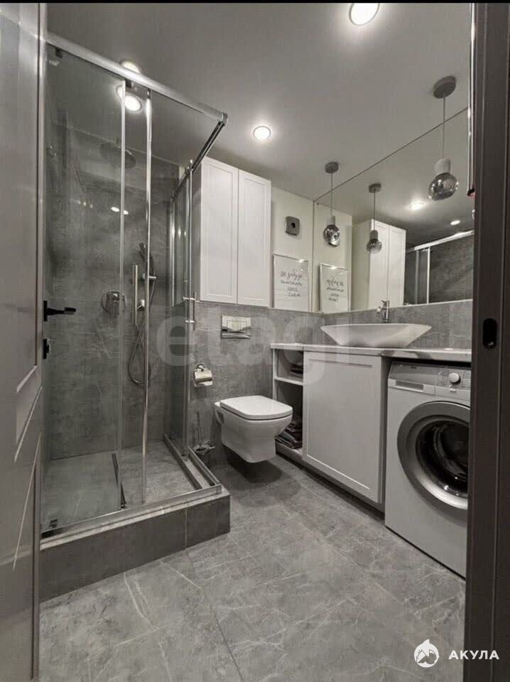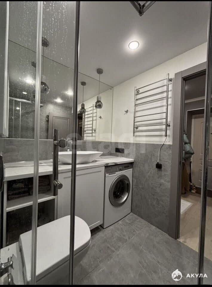- Санузел совмещённый: современная европейская сантехника и плитка премиум-класса, предусмотрено много мест хранения и зона постирочной, установлен водонагреватель.
