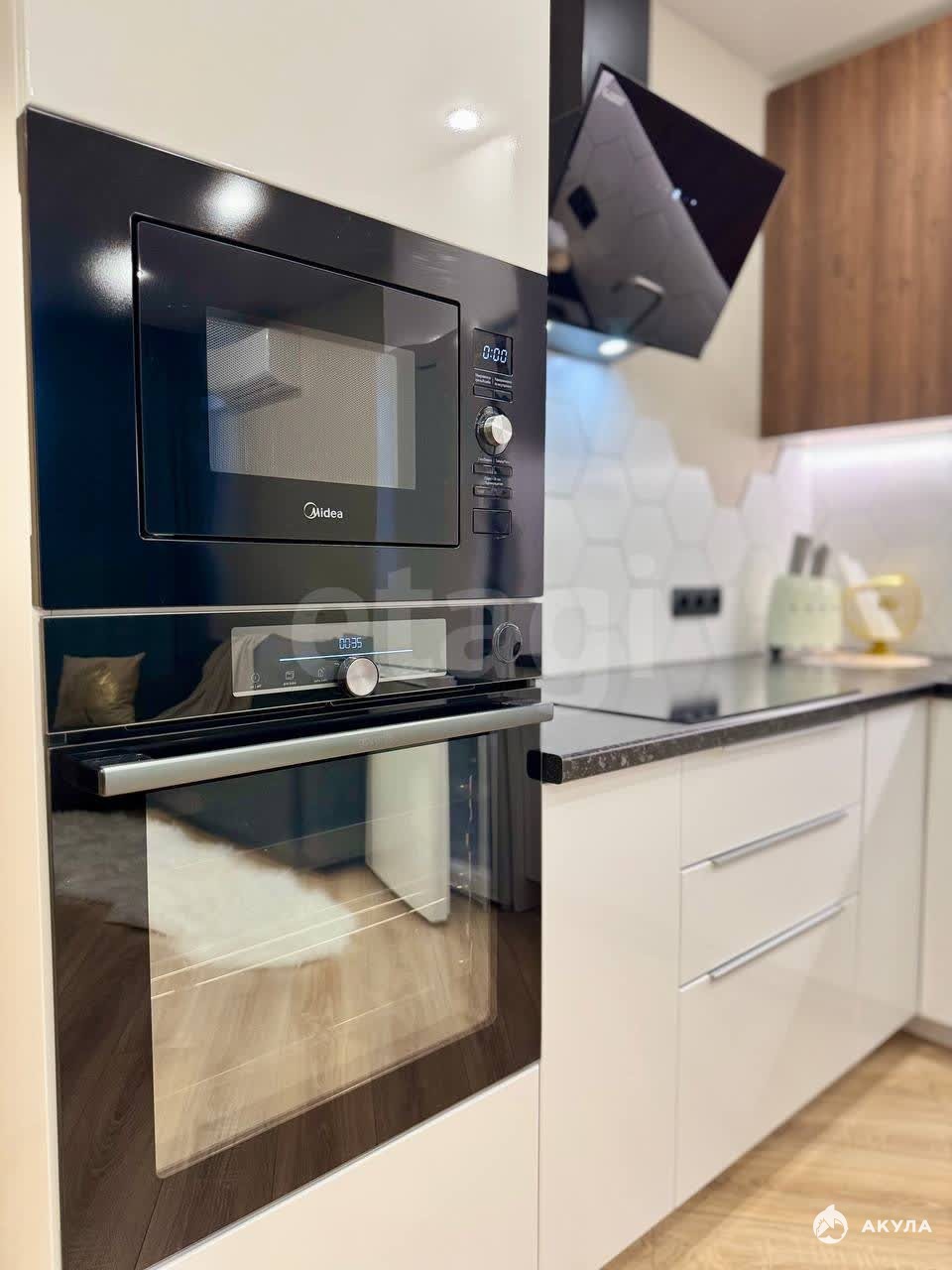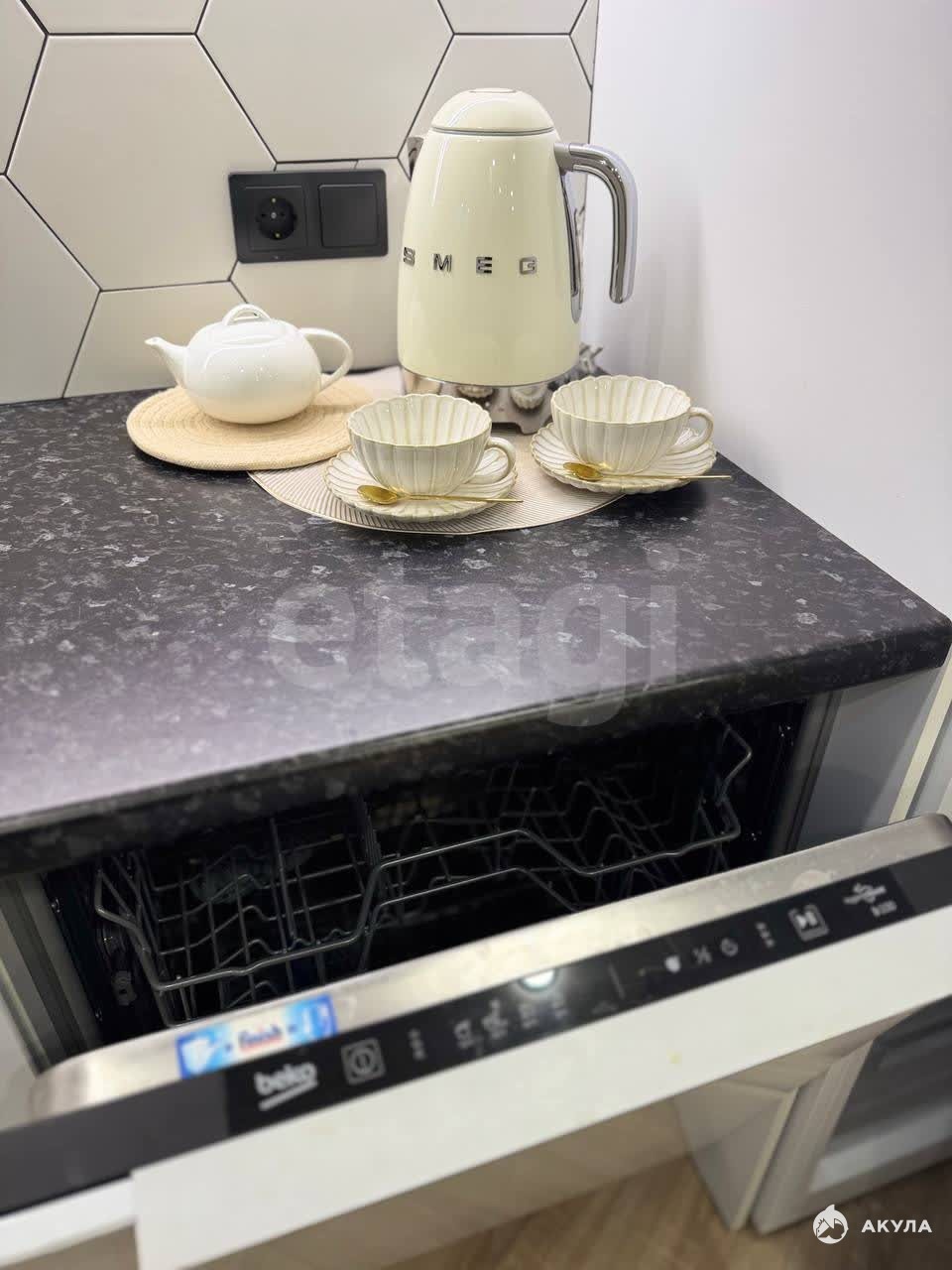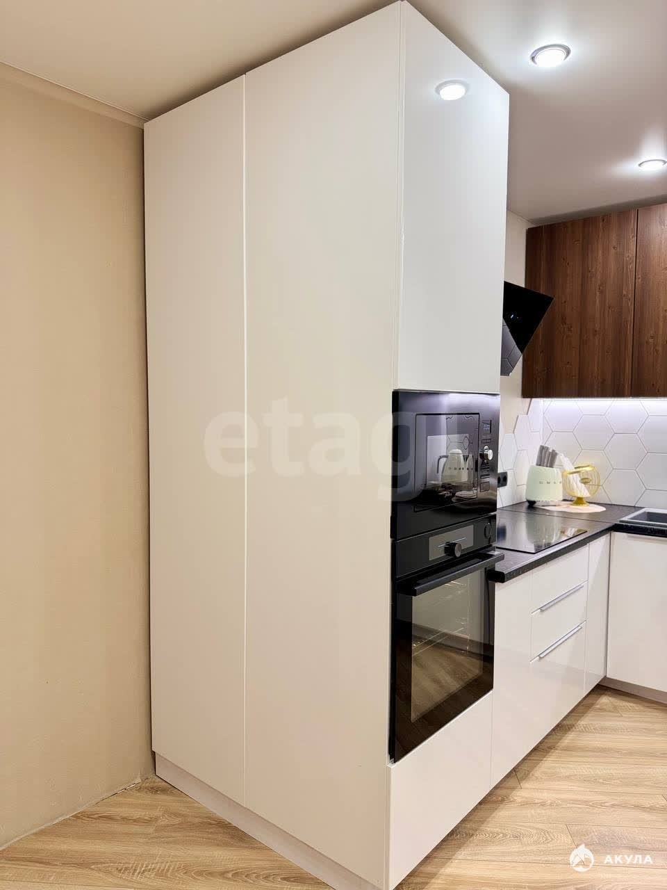 В квартире выполнен свежий ремонт в светлых тонах, установлены кондиционер и система теплого пола. Кухня полностью укомплектована качественной техникой и оснащена практичной каменной раковиной, также предусмотрена отдельная гардеробная.