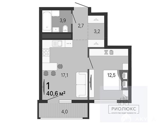 Общая площадь квартиры составляет 40, 6 квадратных метров, из которых 17, 1 квадратных метров приходится на кухню, а жилая площадь — 12, 5 квадратных метров. В квартире одна комната.