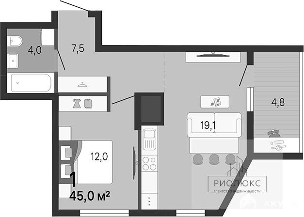 Просторная кухня площадью 19, 1 м² станет настоящим сердцем вашего дома — здесь хватит места для обустройства зоны приготовления пищи и обеденной группы. Жилая площадь составляет 12 м², и комната позволит организовать пространство по вашему вкусу, создавая атмосферу уюта и гармонии.