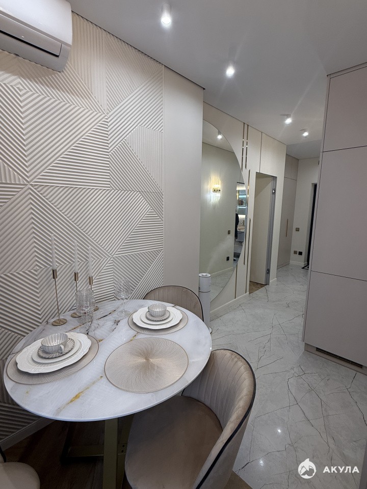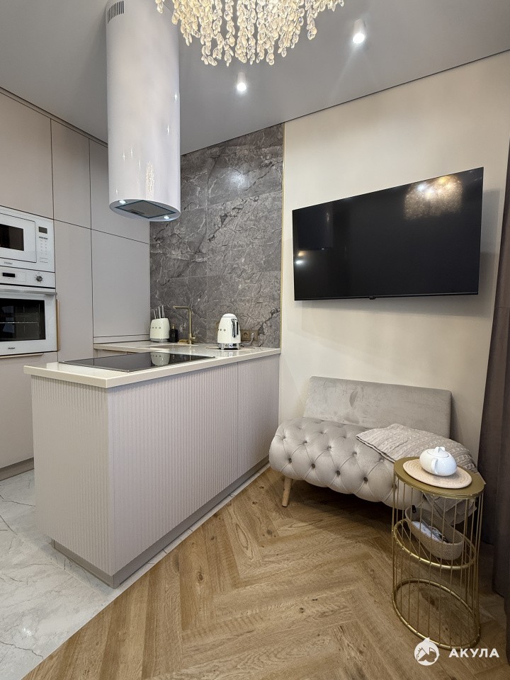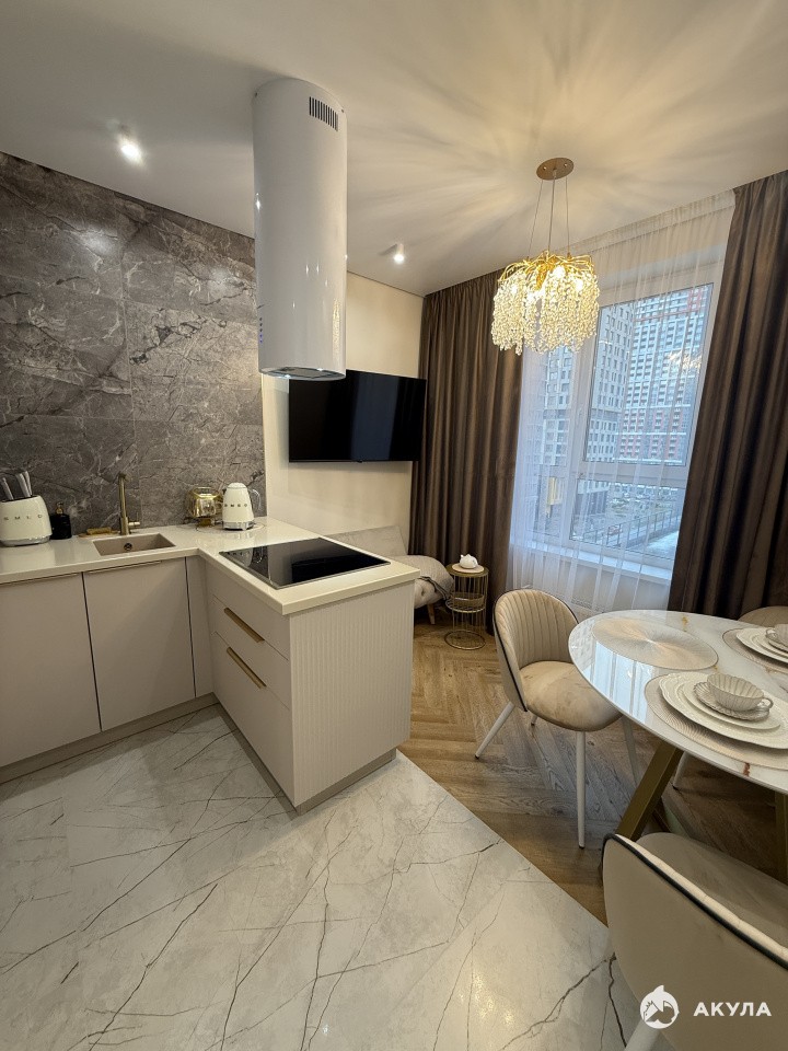 Просторная однокомнатная квартира с функциональной кухней, где есть большой стол и стильный остров для удобного приготовления еды. Кухня оборудована всей необходимой техникой, что делает процесс готовки приятным и комфортным.