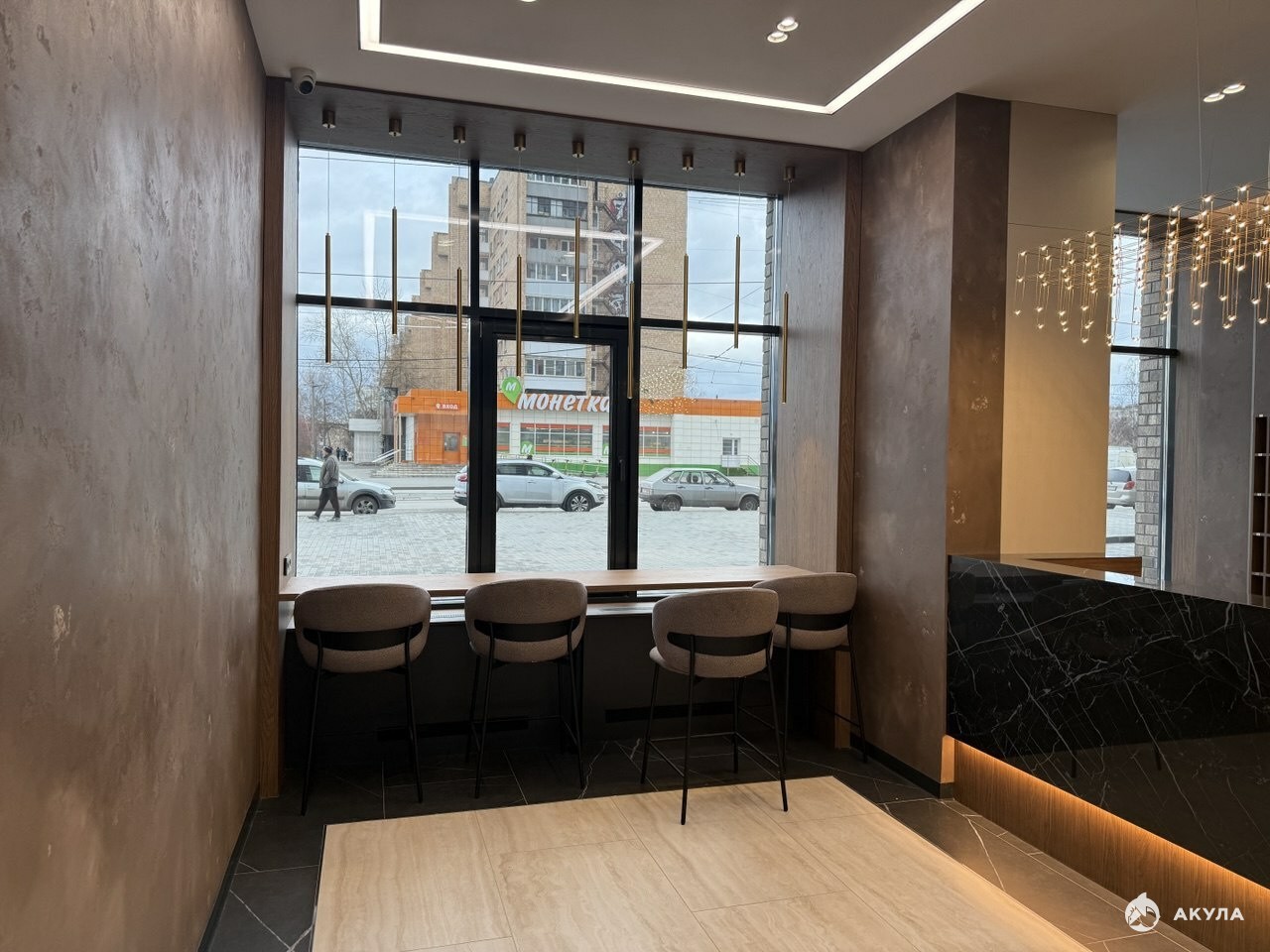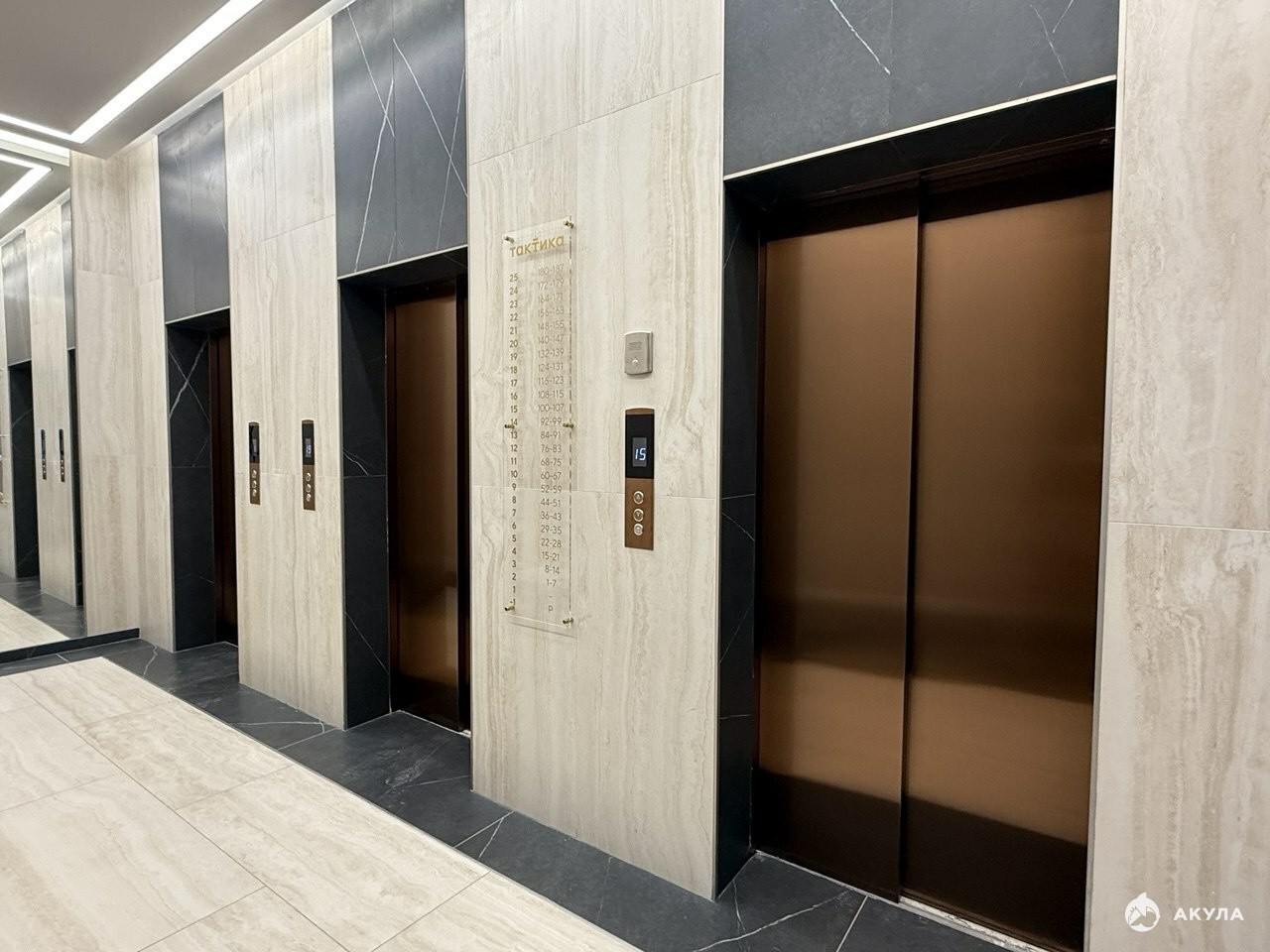 Особенная архитектура. Холл жилого комплекса выполнен в элегантных и минималистичных тонах. Служба мониторинга.