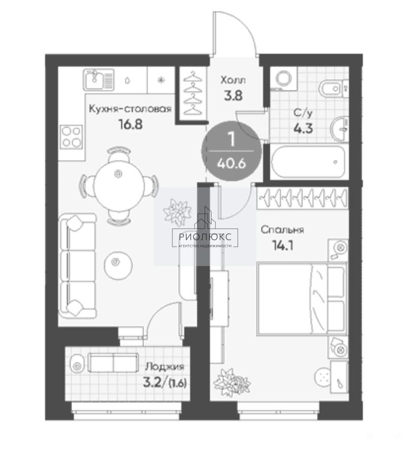 Общая площадь квартиры составляет 40, 6 квадратных метров, из которых 17 квадратных метров — жилая площадь. Здесь достаточно места для создания уютной и функциональной обстановки.