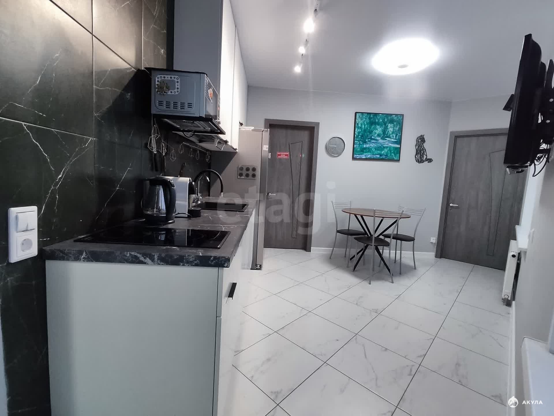 Две комнаты включая спальню с роскошной круглой кроватью и просторной гардеробной, просторная кухня с гостинной 21 м2.