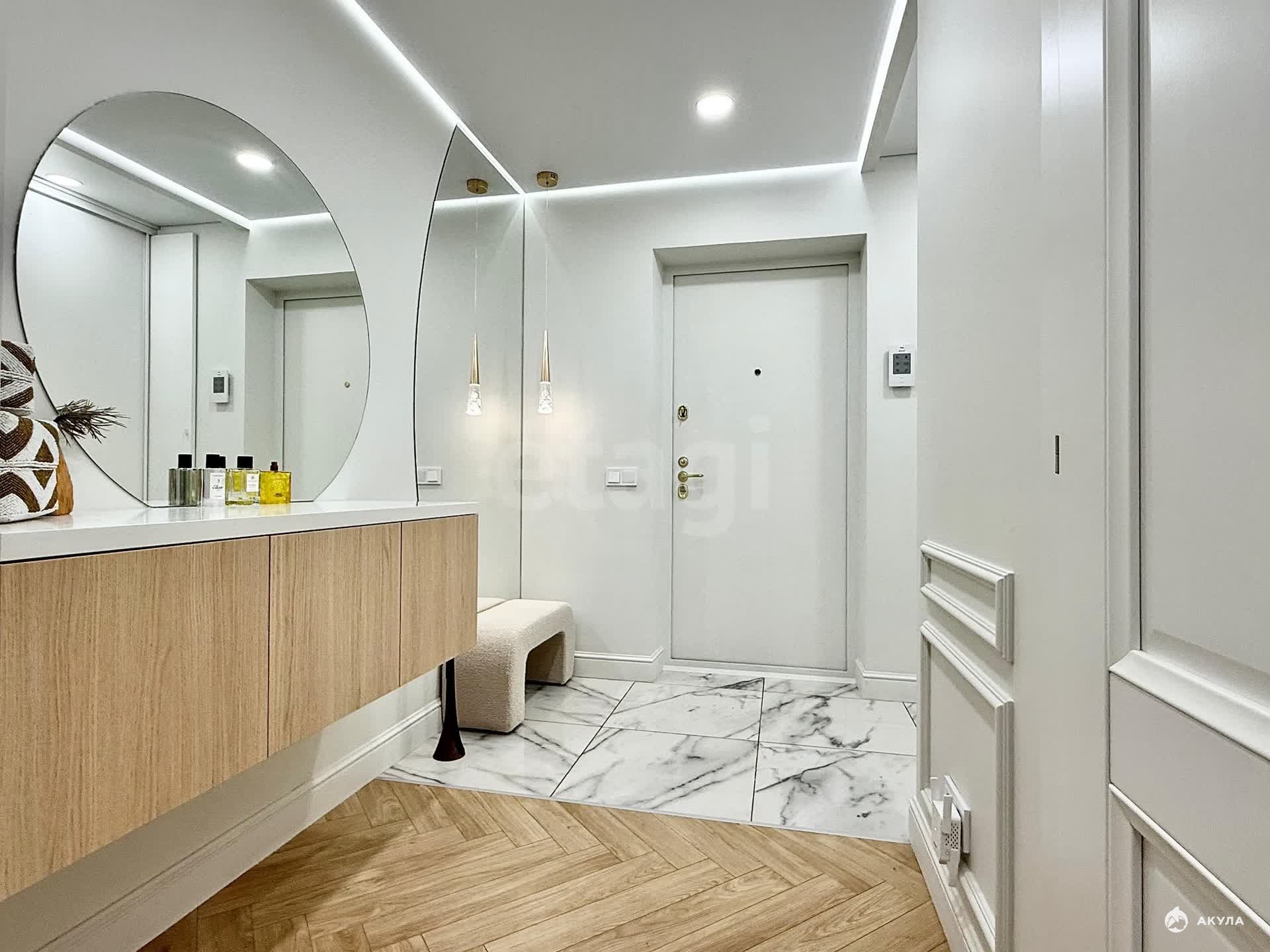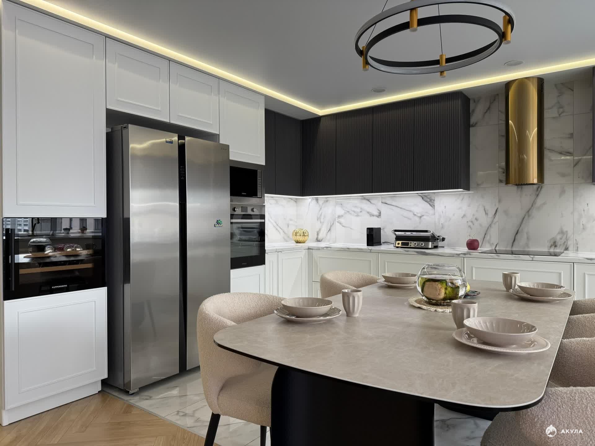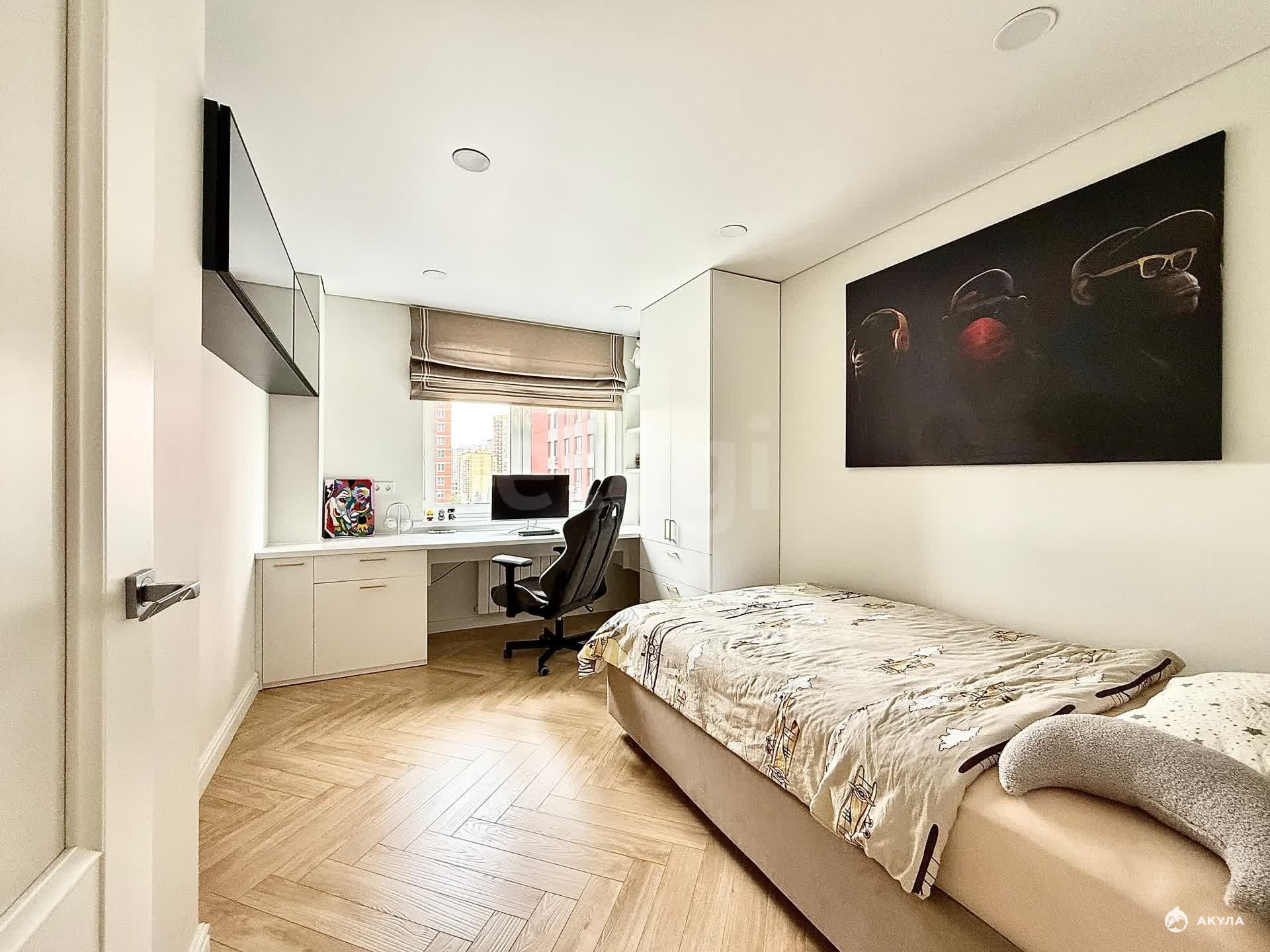 Квартира меблирована большим и вместительным кухонным гарнитуром со встроенной техникой: варочная поверхность, духовой шкаф, микроволновая печь, посудомоечная машина, винный шкаф, вытяжка. Также остается: вся мебель, техника и предметы интерьера.