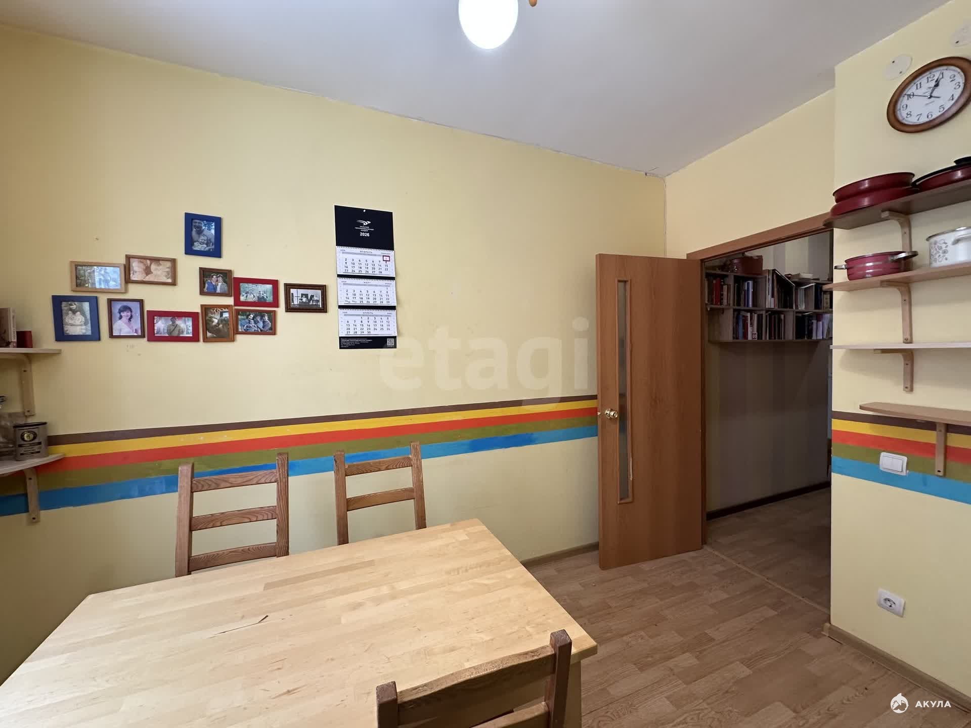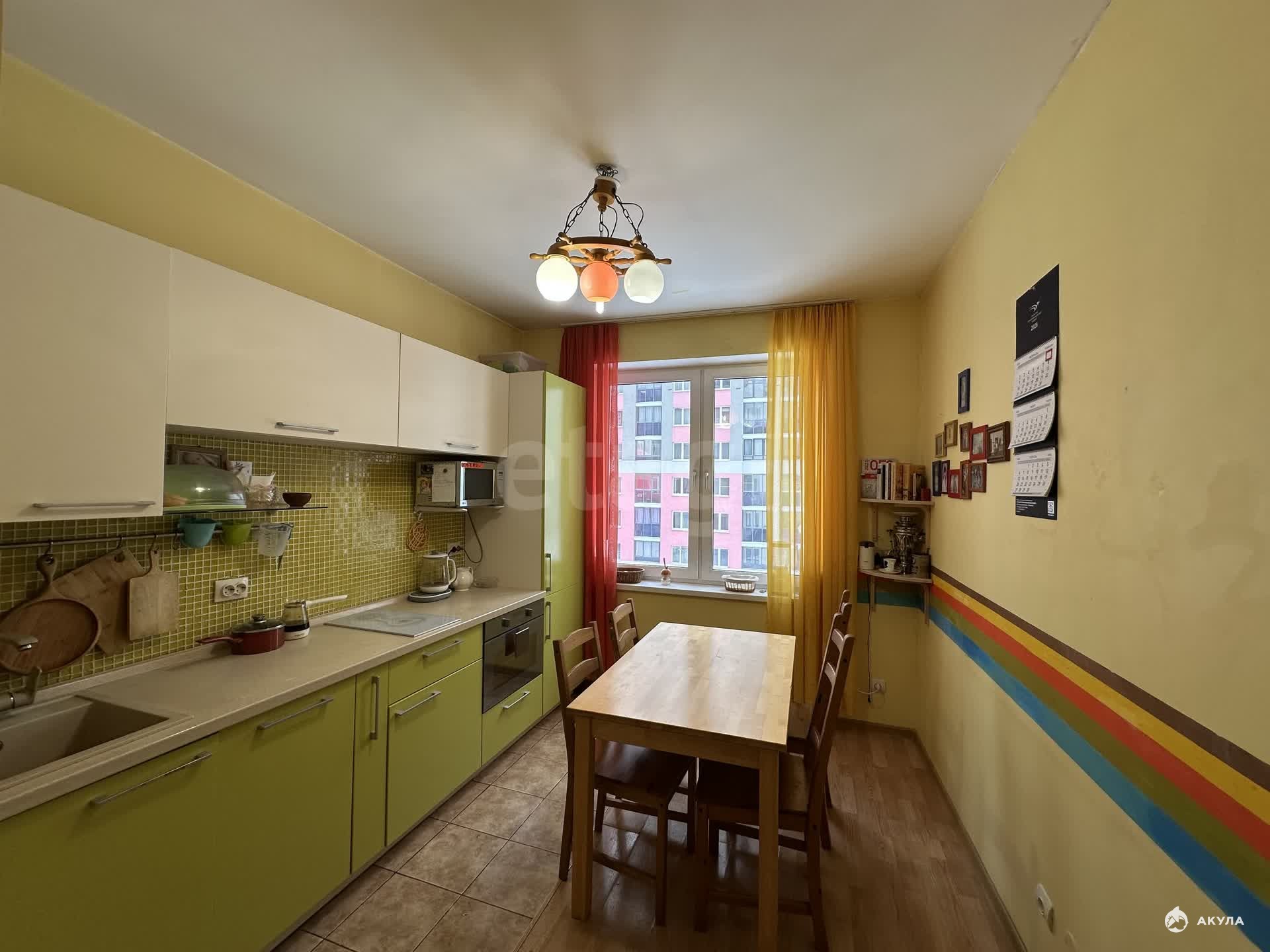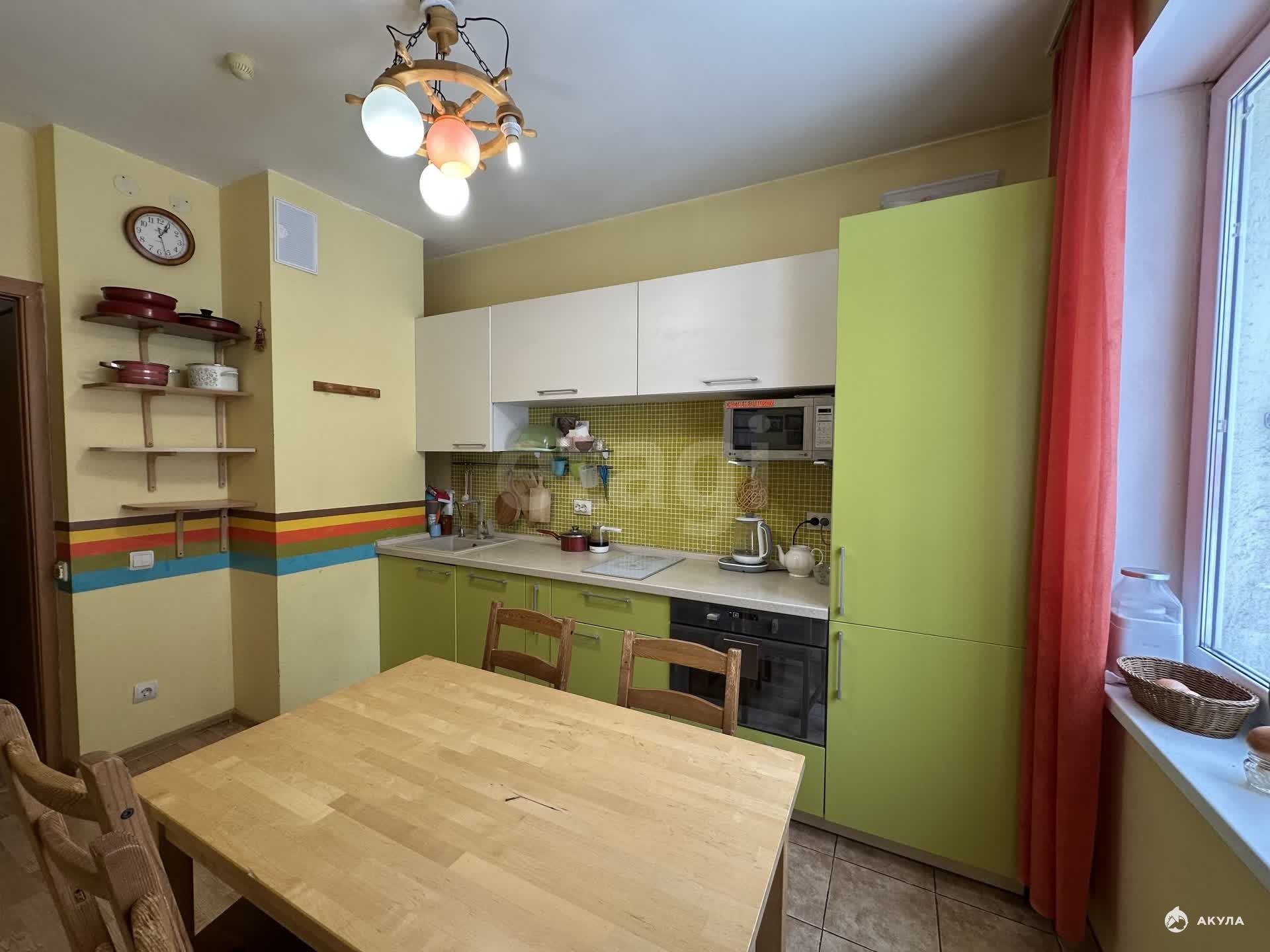 На кухне установлен кухонный гарнитур со всей необходимой встроенной техникой (посудомоечная машина, варочная плита, духовой шкаф, холодильник), вся мебель и техника остается. А также стиральная машина и два встроенных шкафа.