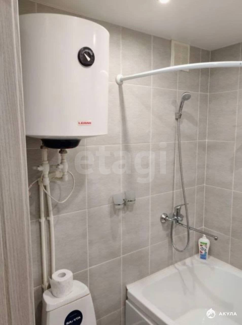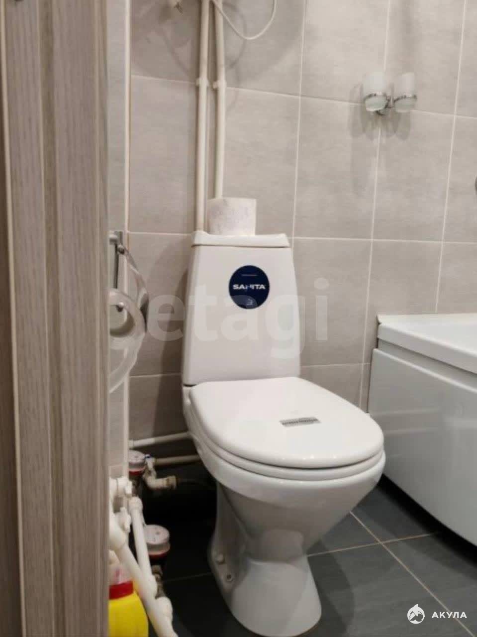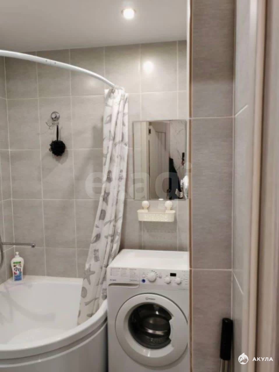 В квартире совмещенный санузел с современной сантехникой и стиральной машиной. Входная зона выполнена в светлых тонах и оснащена вместительными шкафами для хранения.
