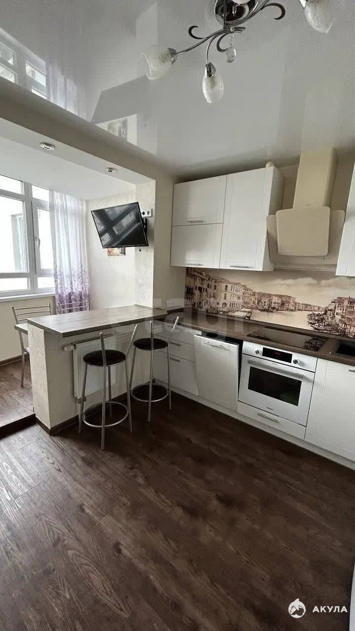 Площадь кухни увеличена за счет присоединения балкона, что создает просторное и светлое помещение для приготовления пищи и приема гостей. Кухня полностью укомплектована надежной встроенной техникой известных брендов, которая остается новому владельцу.