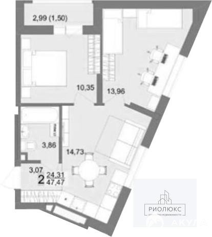 Общая площадь составляет 47, 47 кв. м, из которых 23 кв. м — жилая площадь.