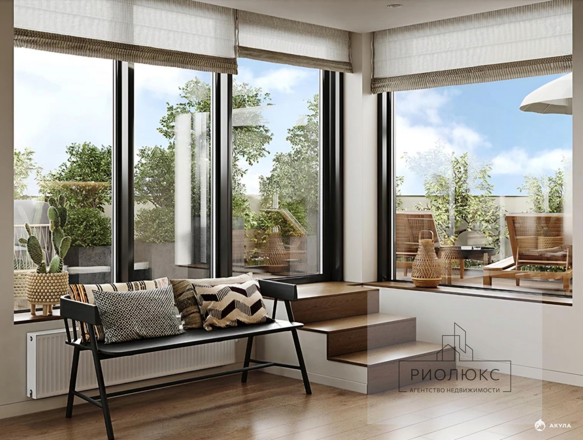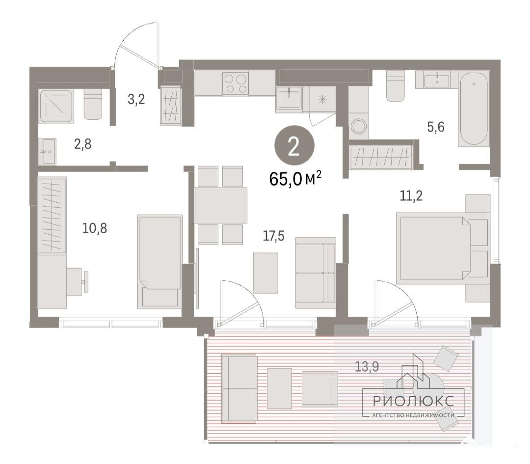 Планировка квартиры: кухня-гостиная 17, 5м, 2 спальни по 10, 8 м и 11, 2 м, 2 санузла и шикарная терраса с панорамным остеклением.