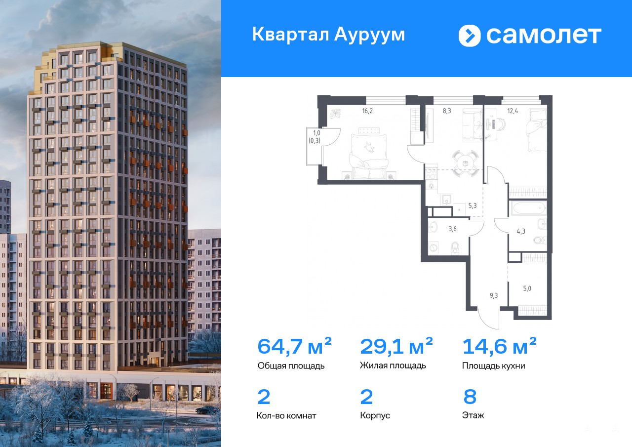 Строим кварталы для жизни с заботой о будущем. Предлагается 2-комнатная квартира бизнес-класса 64, 7 кв.м в корпусе 2 на 8 этаже, в ЖК «Квартал Ауруум»