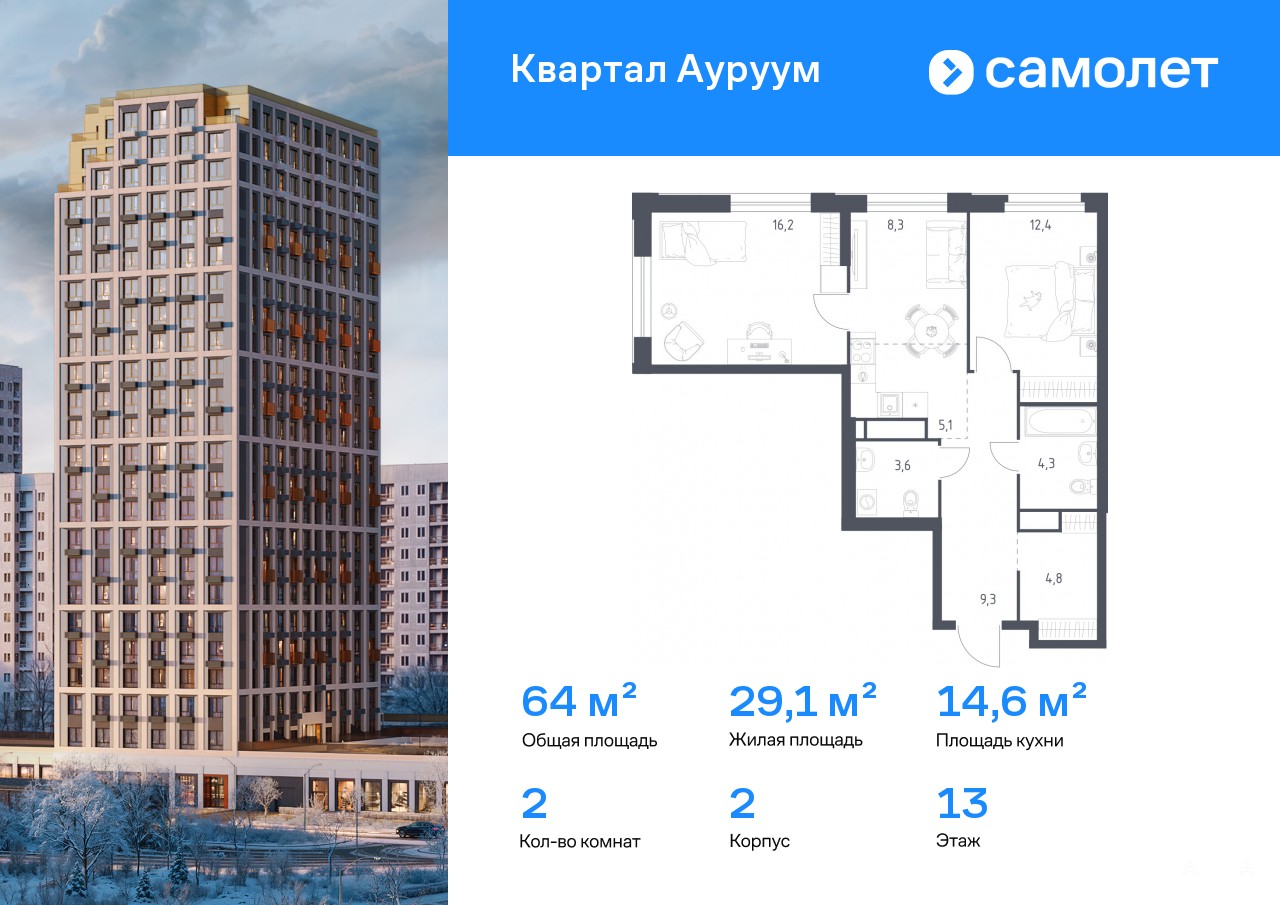Строим кварталы для жизни с заботой о будущем. Предлагается 2-комнатная квартира бизнес-класса 64 кв.м в корпусе 2 на 13 этаже, в ЖК «Квартал Ауруум»