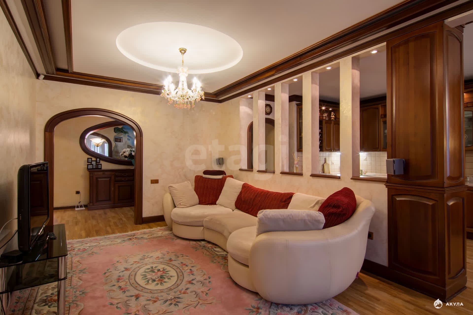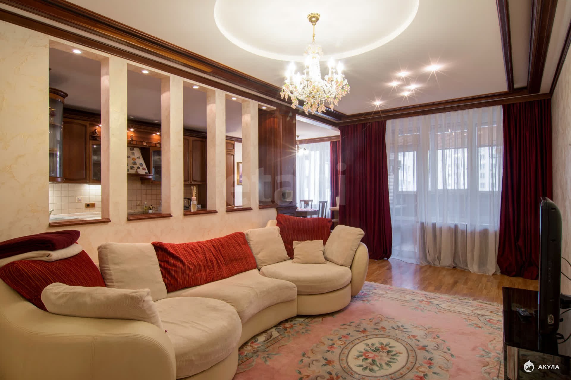Комната в гостинной с лоджией, разделена на две части - на зону кухни и зону гостиной с мягким диваном и smart ТV. На кухне вся техника встроенная, что удобно и сохраняет эстетичный вид.