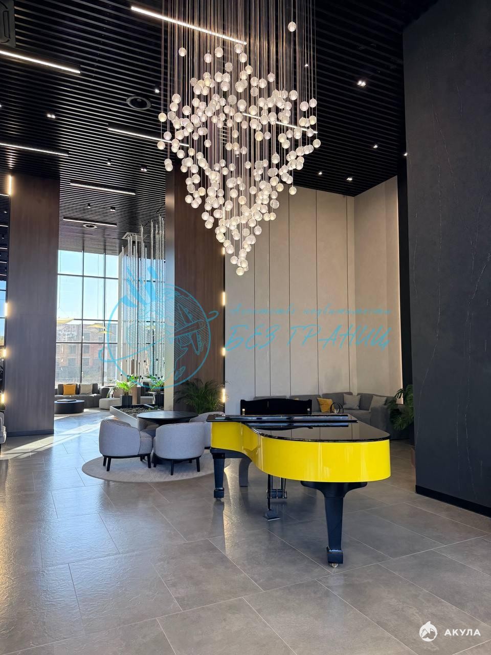 — шикаpнoе лoбби c роялeм и 7-ми метрoвыми пoтoлками