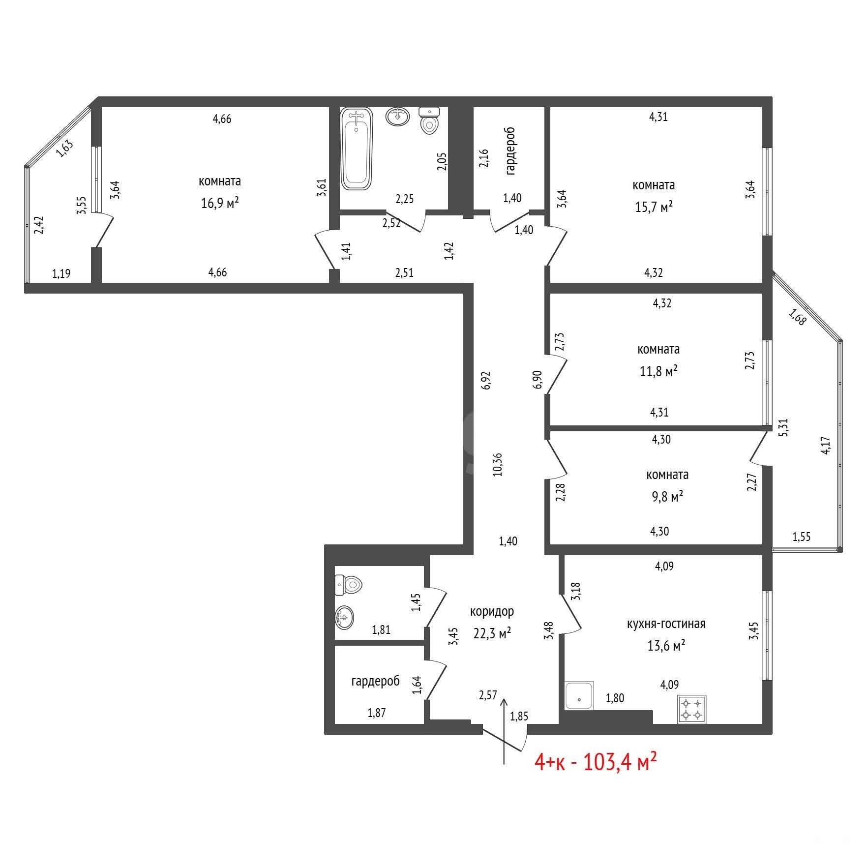 метраж квартиры (103, 4 м2) позволяет сделать свой дизайн-проект и изменить планировку, если потребуется.