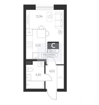 Общая площадь — 26, 7 м², из которых 12, 94 м² — жилая площадь, а 5, 26 м² — кухня.