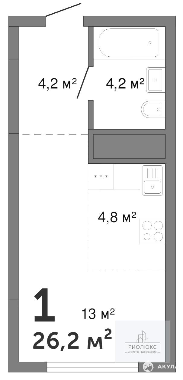 В небесной вышине, на двадцать первом этаже, парит эта светлая студия, словно облако в лучах заката. Новостройка с тридцатью уровнями открывает перед вами мир безмятежности и современного комфорта. Общая площадь в 26.2 квадратных метра продумана до мелочей, создавая удивительно гармоничное и функциональное пространство, где каждая деталь служит красоте и удобству.